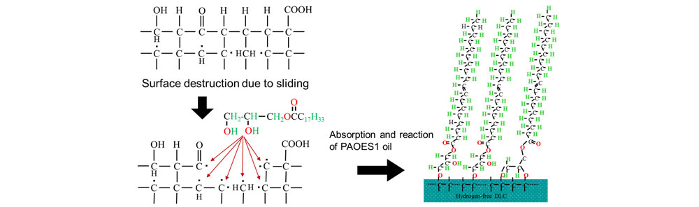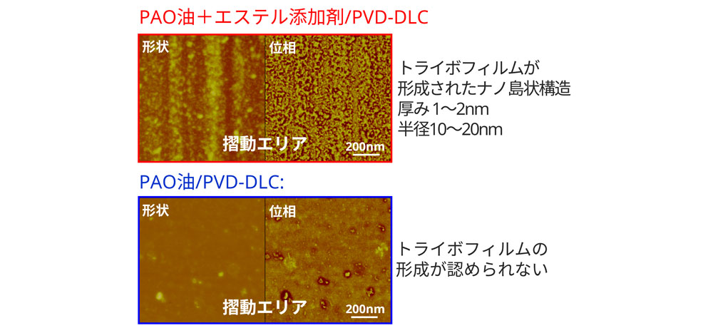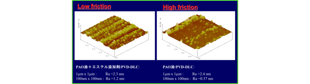 トライボフィルムはDLCコーティングと化学結合した分子鎖を形成し、ナノメートルスケールの微細構造と摩擦係数を低減させる効果があることがわかりました。