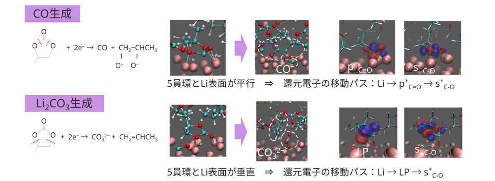 ・Li金属表面におけるPC分子の還元分解反応シミュレーションで確認された生成物は実験と対応