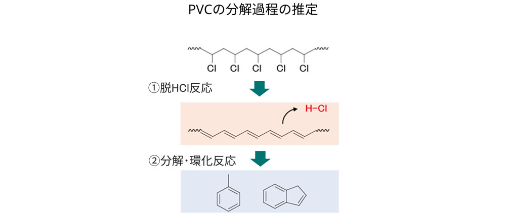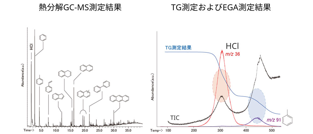 PCのような縮合系樹脂は熱分解パターンが複雑ですが、反応熱分解により単純な測定結果が得られます。また、反応熱分解の生成物から、分子構造の変化や劣化物の生成過程を推定できます。