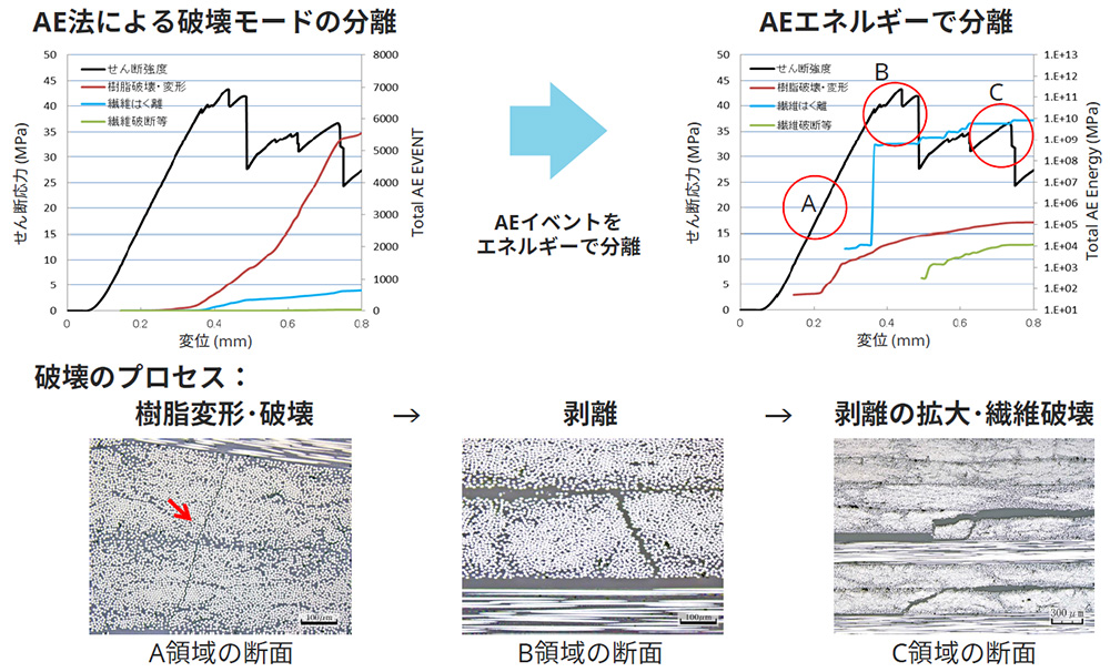 AE解析では、AEイベントをAEのエネルギーで分離することで、より破壊モードを明確にすることが可能です。N-ARC法による可視化技術を用いて、樹脂破壊や層間剥離の様子を観察した結果を示します。