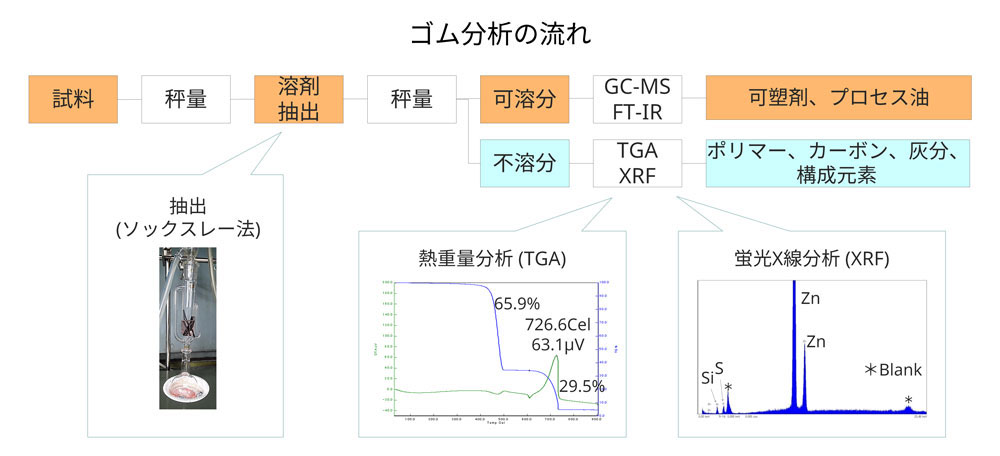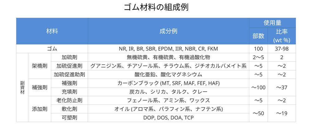 複合材料であるゴムは、種類が多く、用途によってはゴム以外の副資材が60%以上配合される場合があります。また、ゴムの性能 (力学、化学) は、架橋密度、補強剤および添加剤の種類や量によって異なり、添加剤は使用中の熱やガソリン・水との接触によって減少し、ゴムの性能が変化します。海外での調達や仕様変更など、ゴム材料を迅速・正確に把握することが重要です。