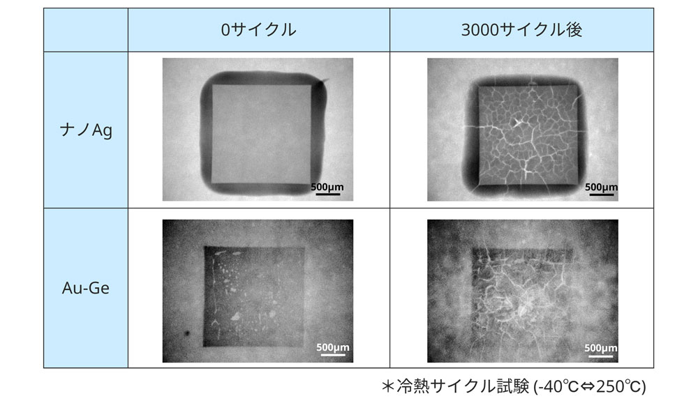 3000サイクル後、両ダイアタッチ材で初期には存在しなかったクラックが認められました。