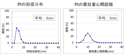 Pt分布を画像解析することで、粒径分布や最短重心間距離 (分散状態の指標) を算出できます。