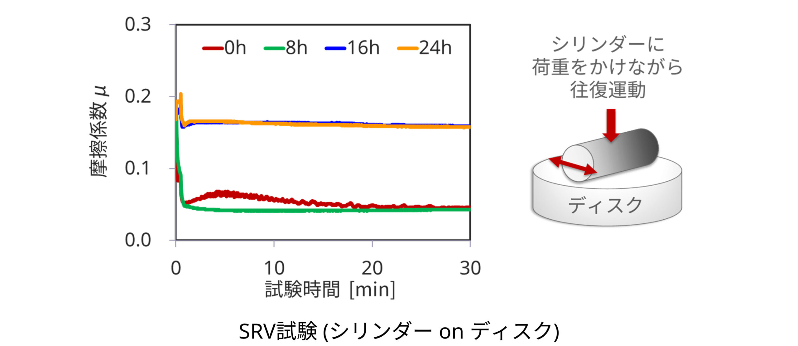 自動車の燃費向上のため、エンジンオイルにはMoDTCに代表される摩擦調整剤、極圧剤、清浄剤など様々な添加剤が含まれます。エンジンの劣化環境を模したNOxバブリング試験により劣化させたオイルを用いて摩擦摩耗試験 (SRV) を行った結果、16時間 (16h) 以上のNOxバブリングを行ったオイルは、0~8hに比べて摩擦係数μ が約3倍に増加しました。