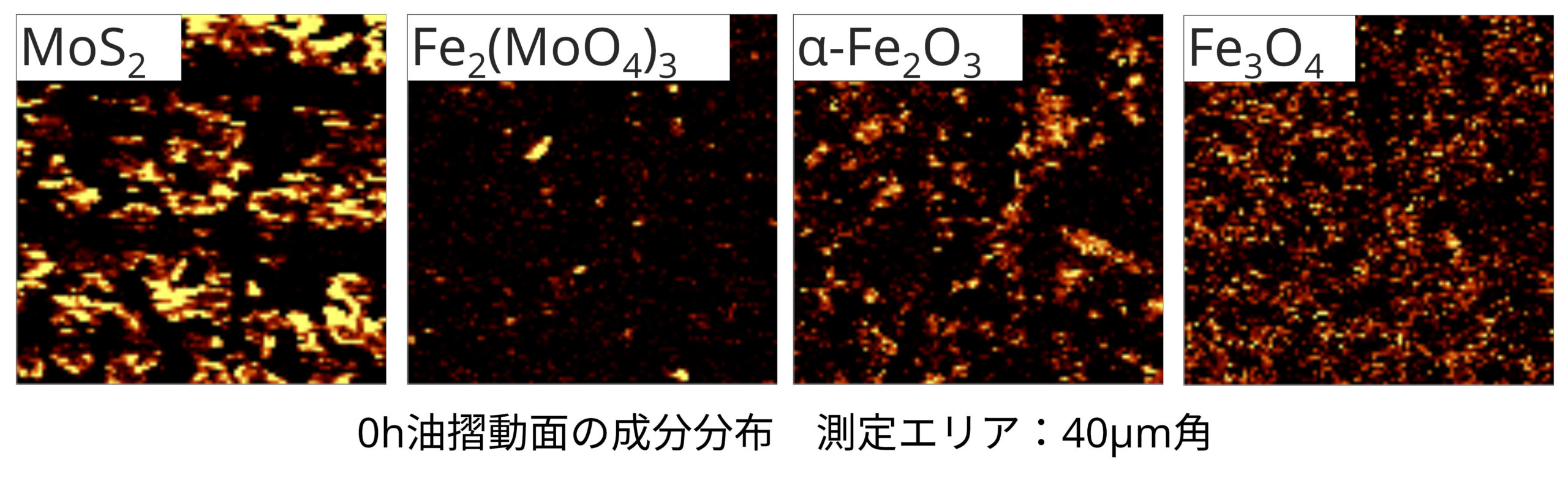 摺動面のラマンスペクトルから、MoS2や各種酸化物が生成していることがわかりました。MoS2はMoDTCが摺動により分解し、生成しているものと推測されます。成分毎の分布をマッピングで調べると、MoS2とα-Fe2O3の分布は相補的であり、Fe2(MoO4)3は局所的、Fe3O4は広範囲に弱く分布していることが確認されました。