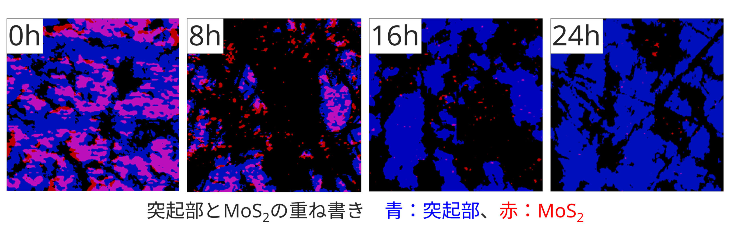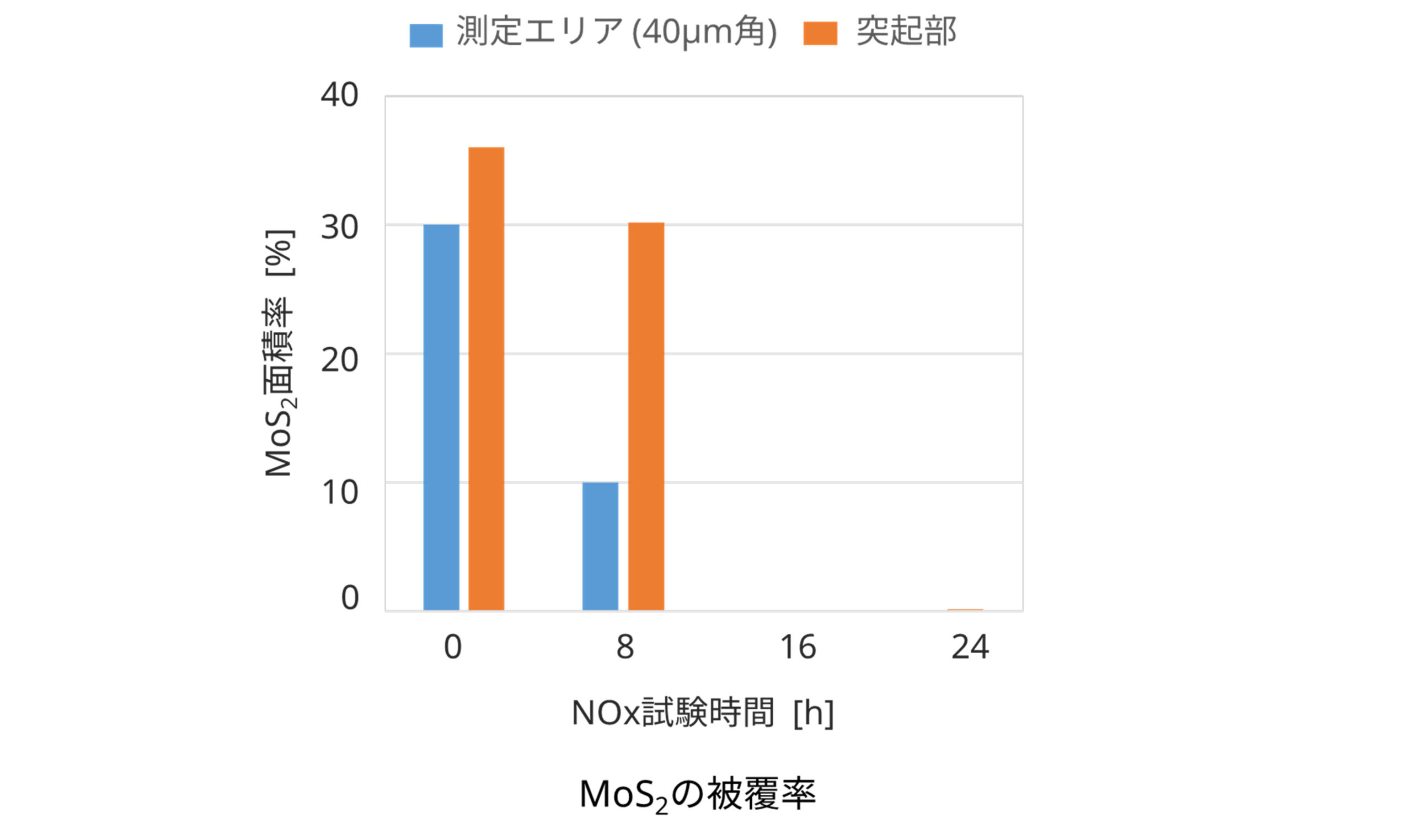 摩擦低減効果の高いMoS2被膜の分布と表面形状の相関が、ラマン分光法による化合物同定とAFMによる形状測定からわかります。エンジンの劣化環境を模した突起部にMoS2が30%以上分布すれば、摩擦係数μが下がることがわかりました。