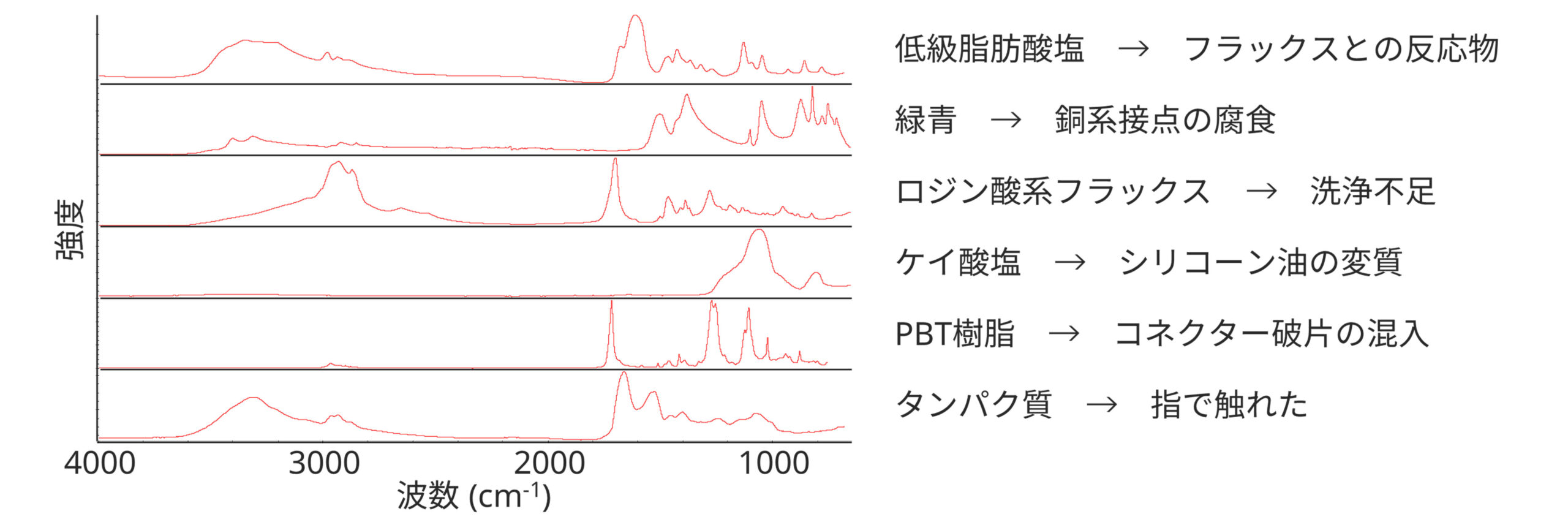 導通不良には様々な原因があります。原因調査のポイントは、①「不良個所を特定する」と②「この部位に存在する物質を明らかにする」ことです。ここではマニピュレータによる導通不良個所の特定と、FT-IR法による端子付着物分析をご紹介します。