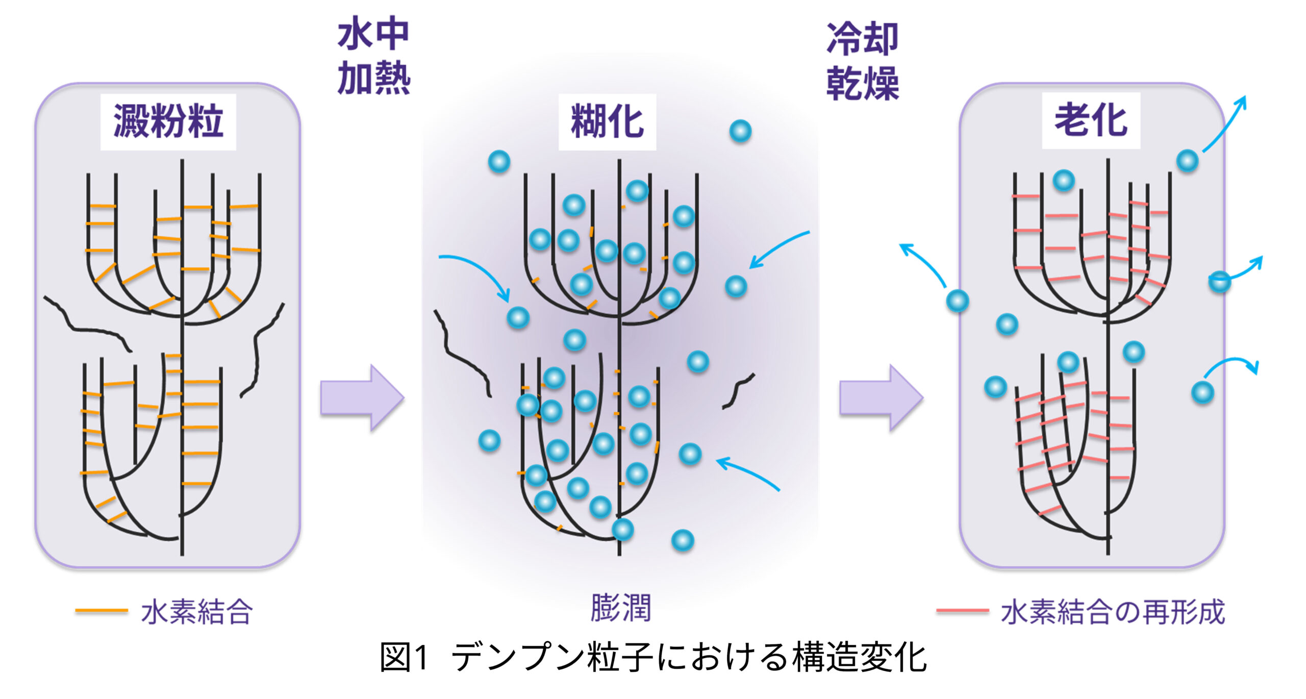 食品、医薬、工業製品などに利用されている天然高分子である「デンプン」の機能性の発現は、水分子の出入りと温度変化に伴う構造変化であり、糊化と老化 (図1) で見られます。