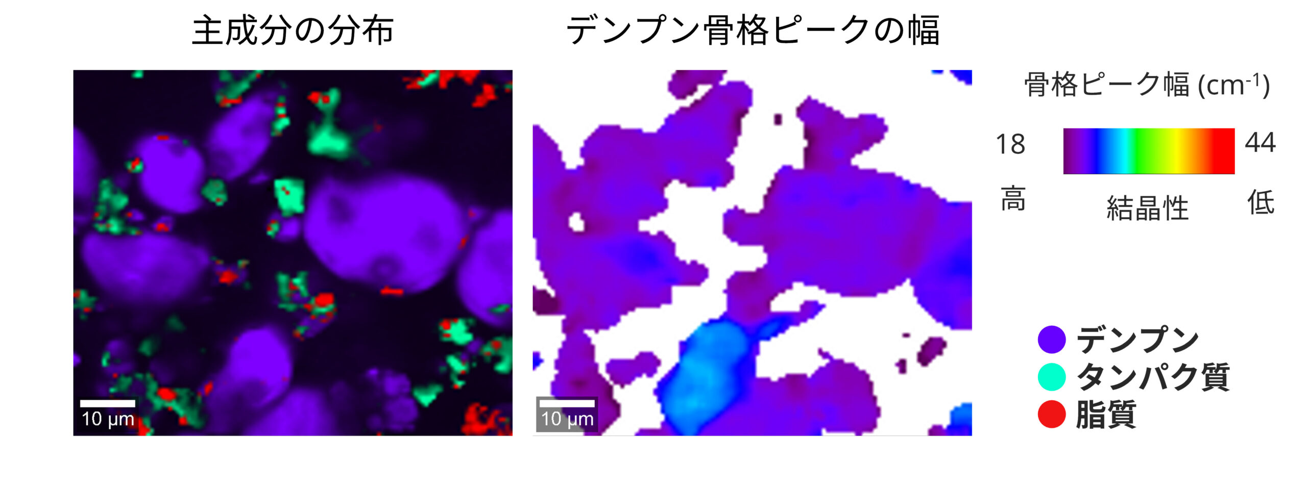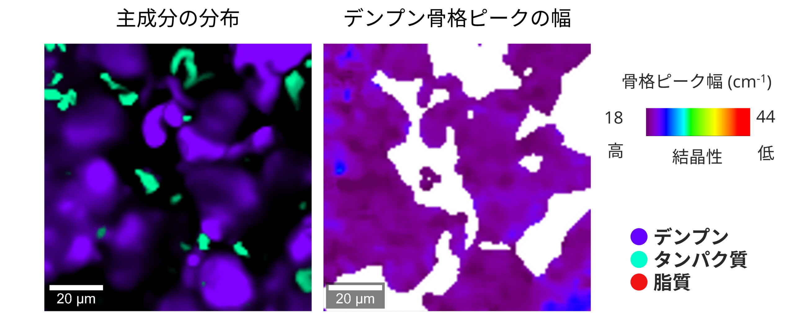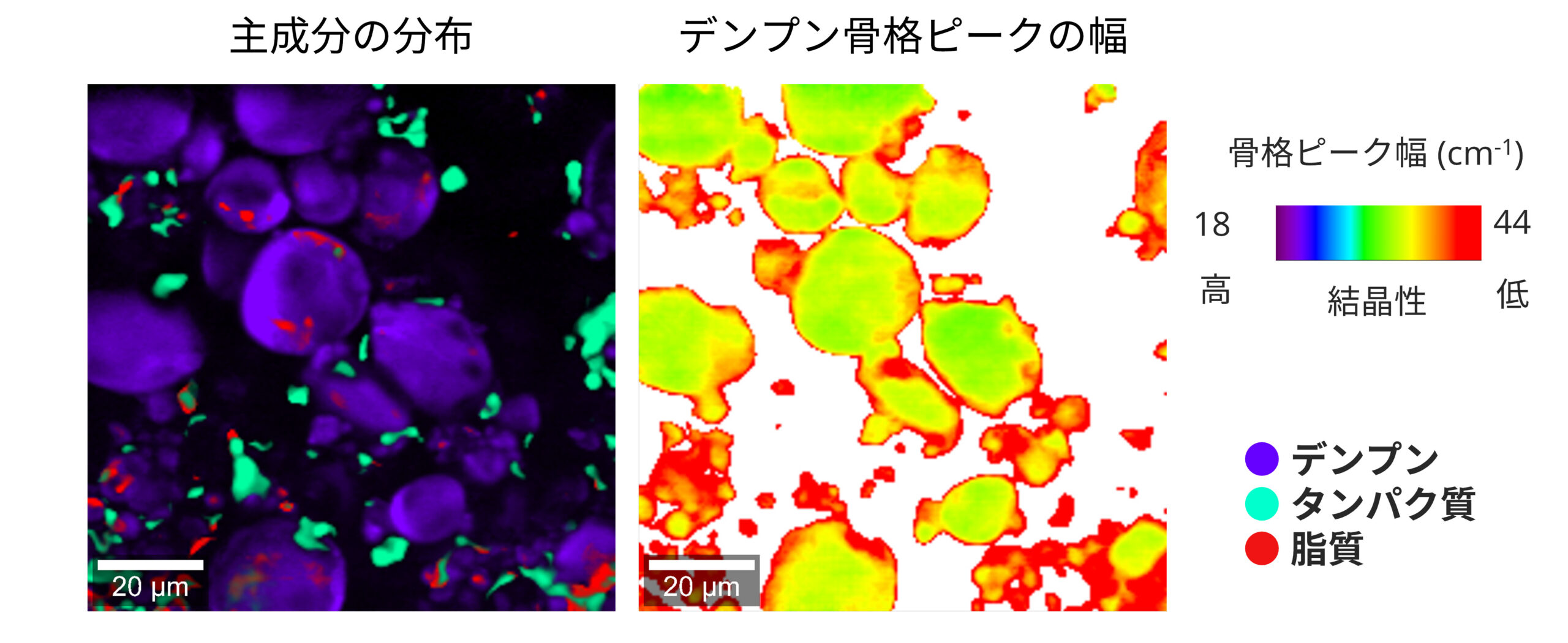 共焦点ラマンマッピング法によりサブミクロンレベルでデンプンの微細構造と化学状態が評価できます。本報では加工によるデンプンの結晶性の変化を可視化することで、溶解性など特性への影響に結び付けることができます。