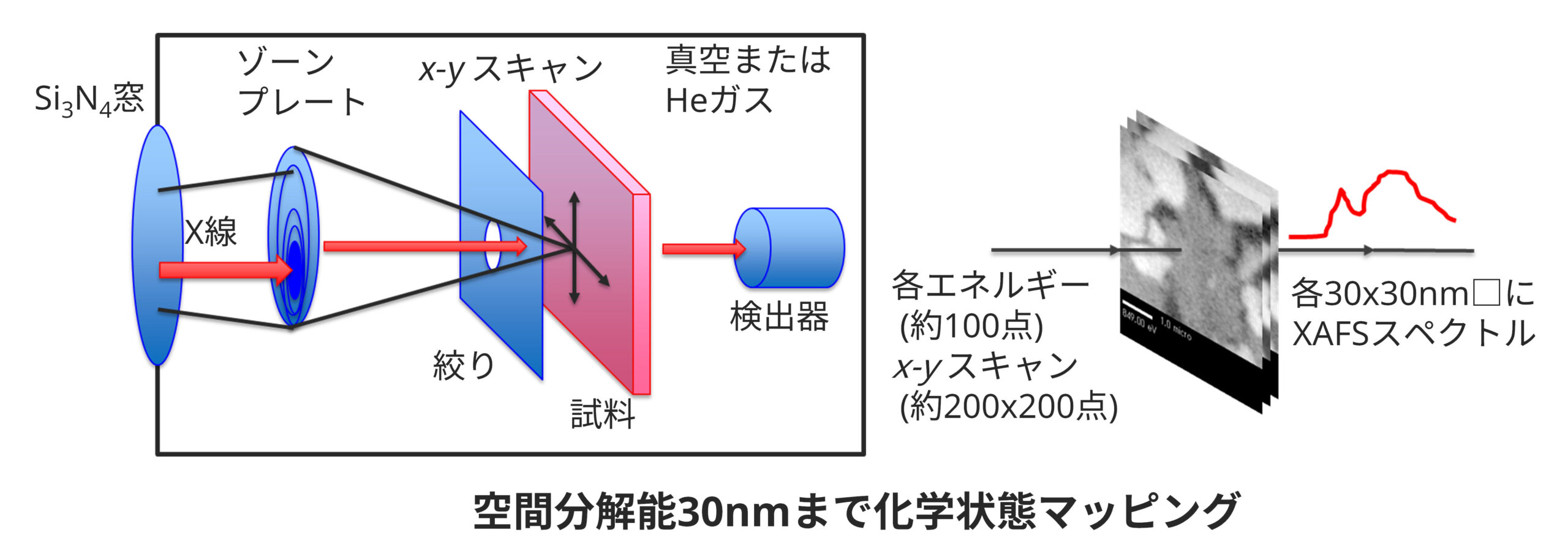 走査型透過X線顕微鏡 (STXM) を利用することで数10nmの分解能で化学状態を議論できます。基本原理はX線吸収 (XAFS) なので他のスペクトロスコピーより詳細な議論が可能です。X線を利用することで試料ダメージが軽減でき、約10μm視野での観察が可能です。
