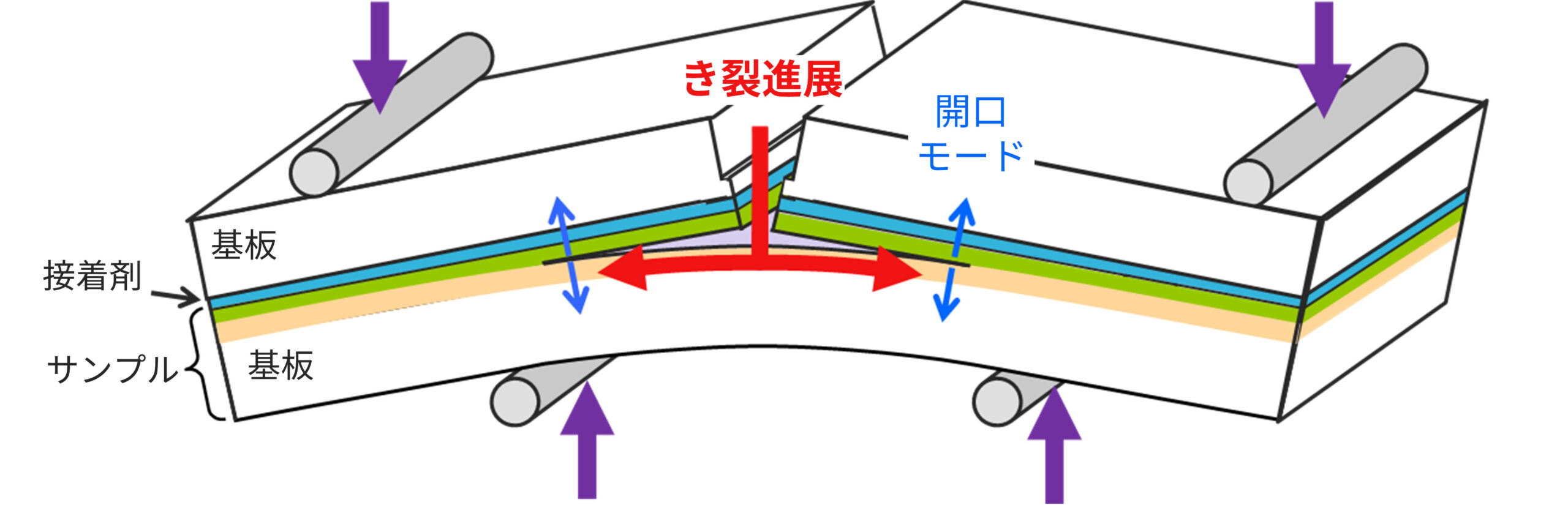 薄膜試料に基板を貼り付け、曲げ・引張モードで試験を行うことにより、薄膜の界面に剥離を生じさせ、単位面積当たりの界面を剥がすエネルギー量であるエネルギー解放率:Gを測定します。