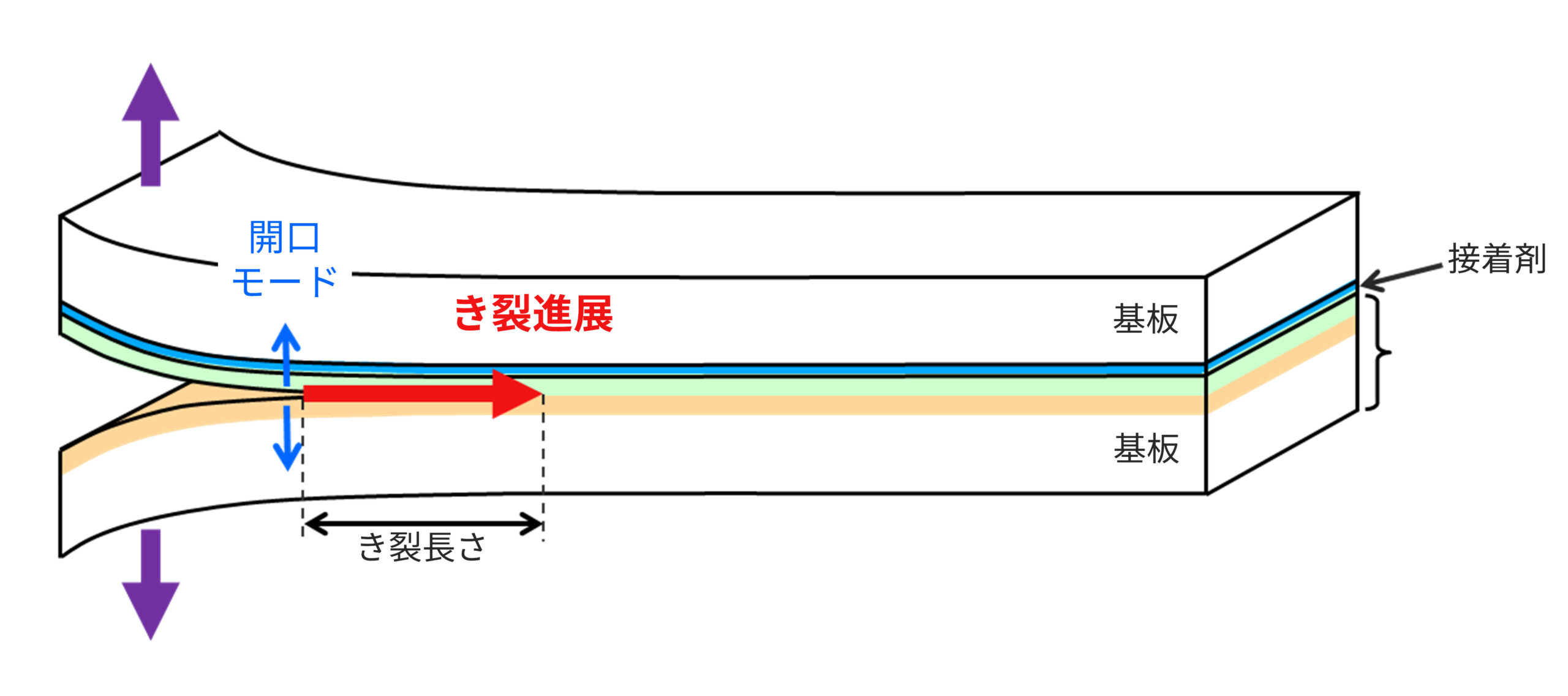 き裂の進展に伴うエネルギー解放率の変化を計測することができます。面内で密着力に変化がある場合の評価に有効な手法です。