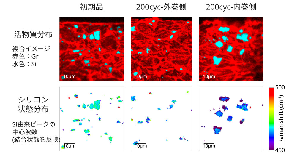 初期品と200cyc品の負極表面をラマン分光法で測定した結果、200cyc品-外巻側では、D/G強度比より、一部のGr活物質の規則性が低下している様子が認められました。また、Si系活物質はアモルファスカーボン (高D/G強度比) で被覆されていることがわかりました。