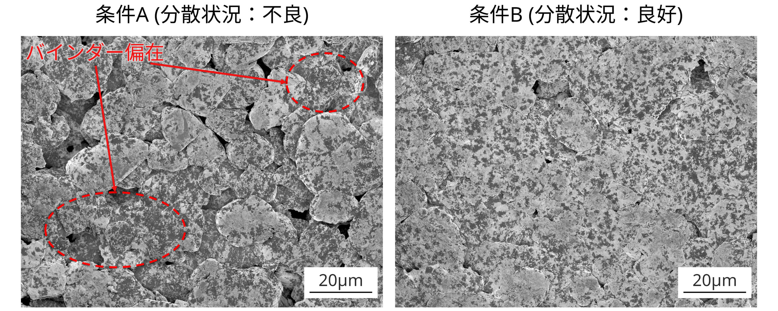 活物質や導電助剤などを結着させるために用いられているバインダーが偏在すると、部材間の密着力や導電性の低下を招く可能性があり、電池特性に影響します。