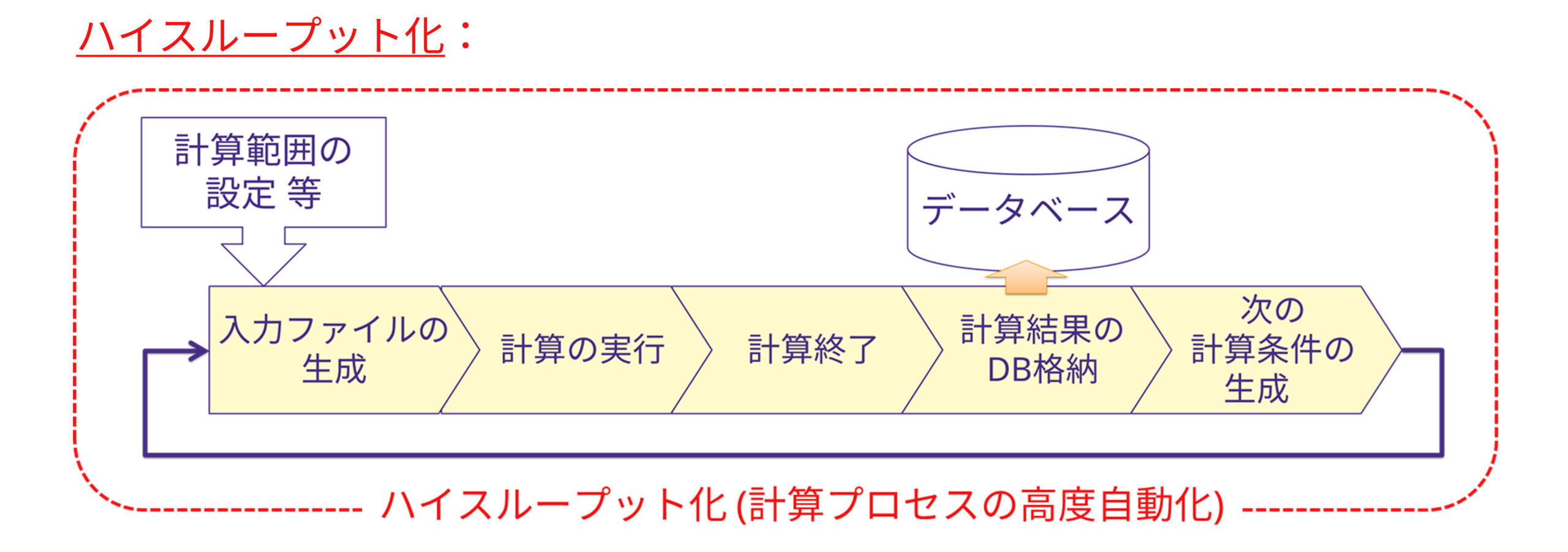 目的に応じた計算範囲の設定等を行ったうえで、入力ファイルの生成、計算の実行を自動化するとともに、計算結果のデータベースへの格納、また次の計算条件の生成を含め計算プロセス全体の高度な自動化を実現しています。
