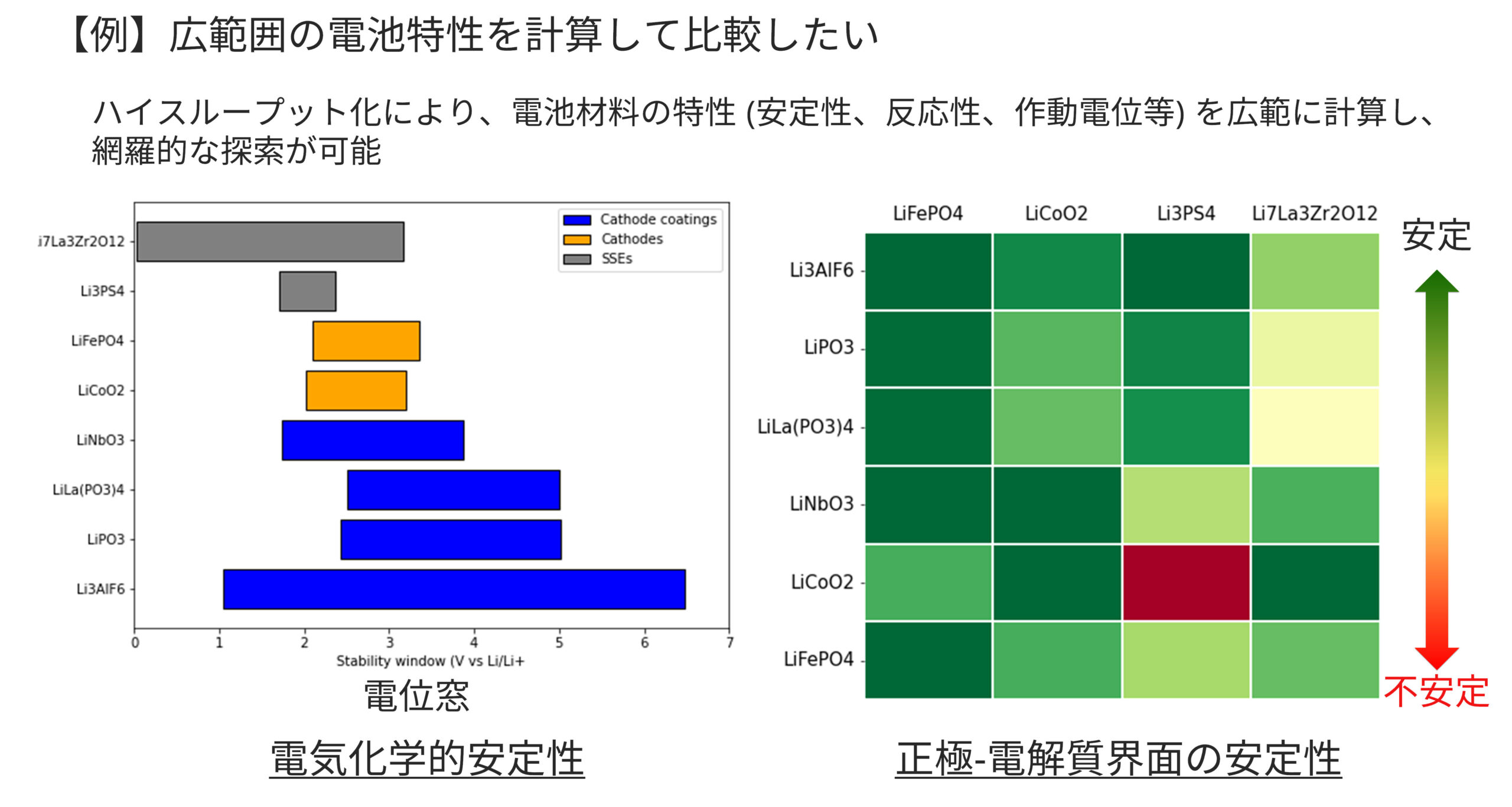 リチウムイオン電池に関して、広範な電池材料を対象して網羅的に電池特性の探索を行った事例を示します。広範な材料を対象に安定性、反応性、作動電位などの評価をハイスループット化技術を活用して実施しました。