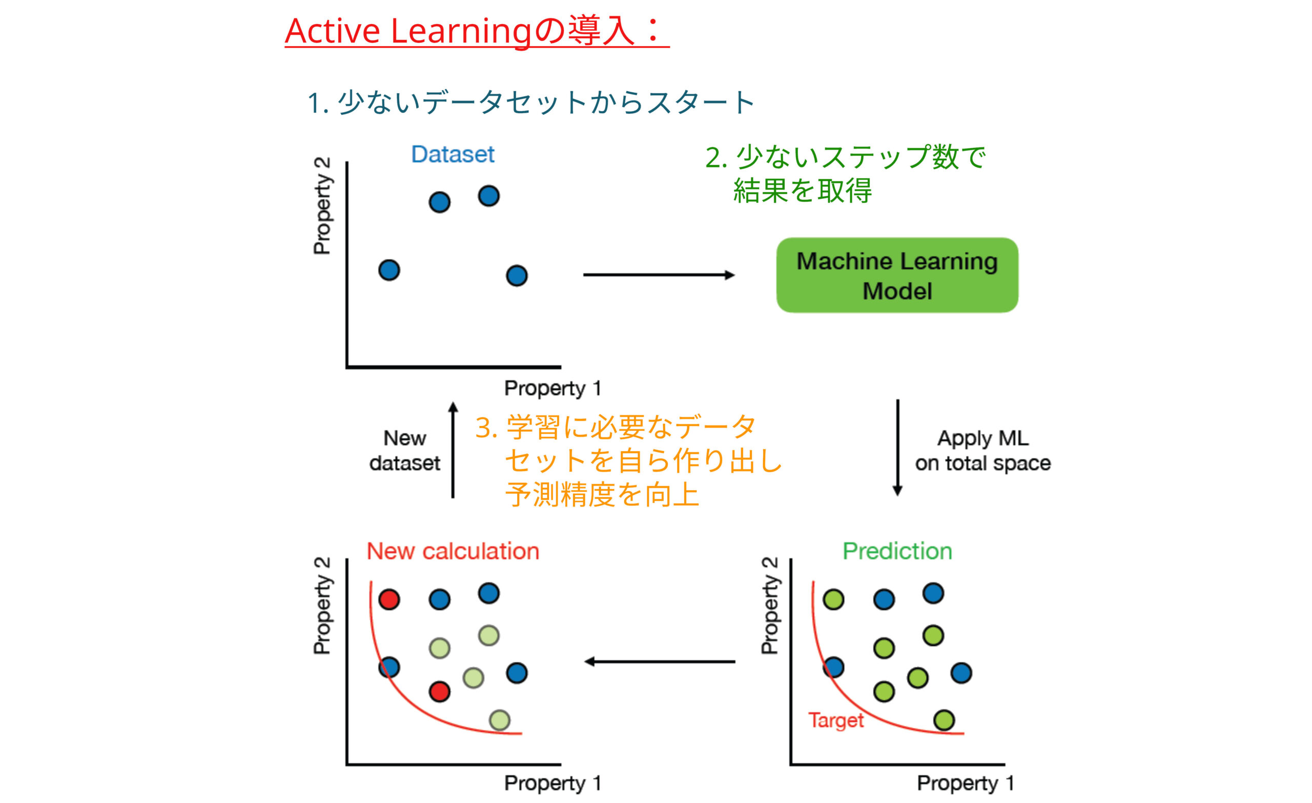 機械学習を活用することで、少ない学習用データからMIをスタートし、得られた結果から次に必要となる学習用データを自ら作り出し、予測精度を向上させることが可能になってきています。このようなActive Learning技術の導入も進めています。