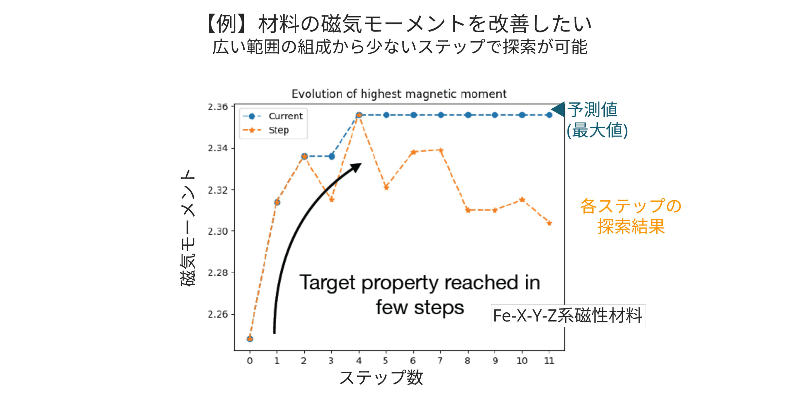 Active Learningを活用して、Fe系磁性材料の磁気モーメントの改善を検討した事例を示します。この事例では、Active Learningを活用することで、わずか数ステップの計算で良好な結果が得られていることがわかります。