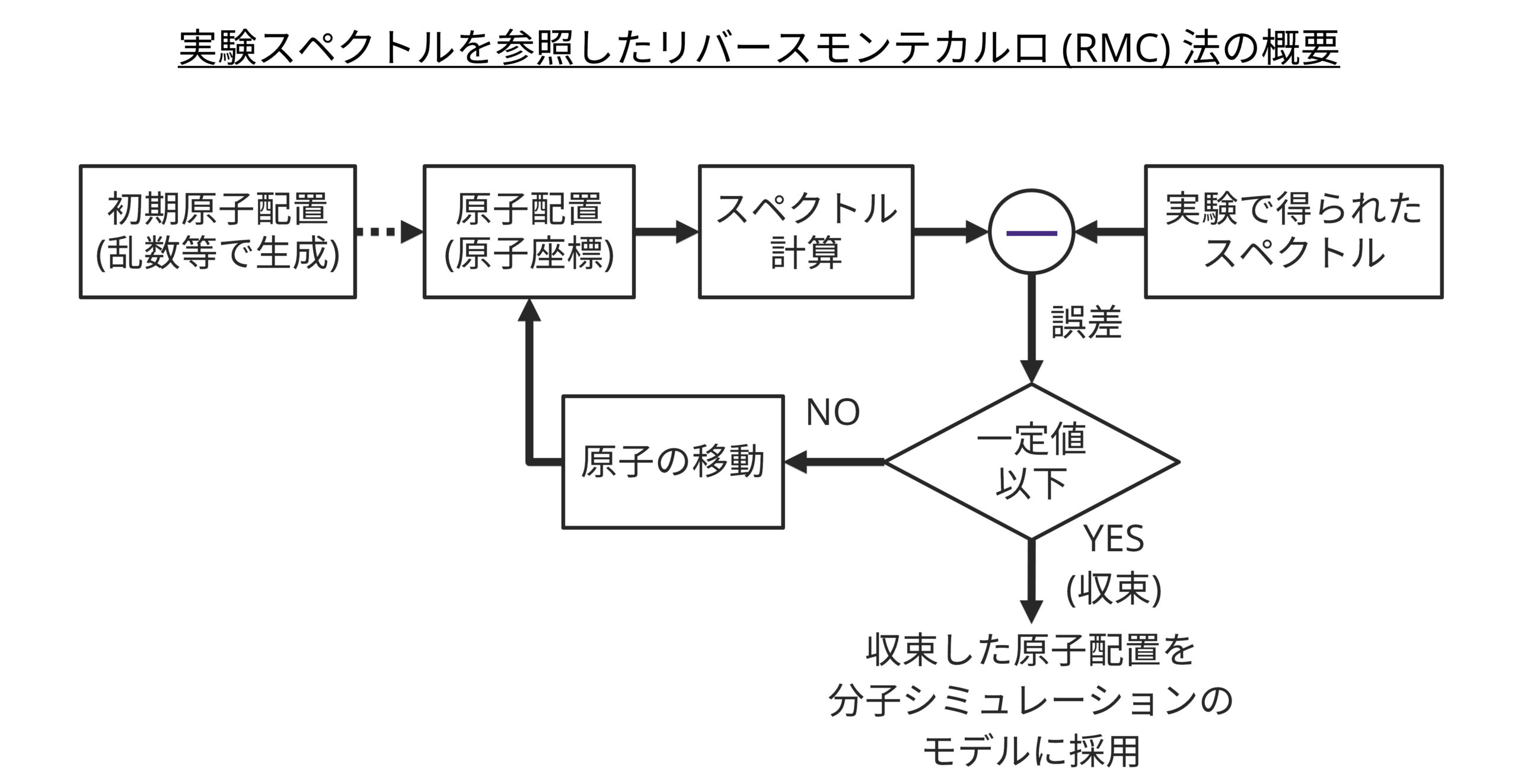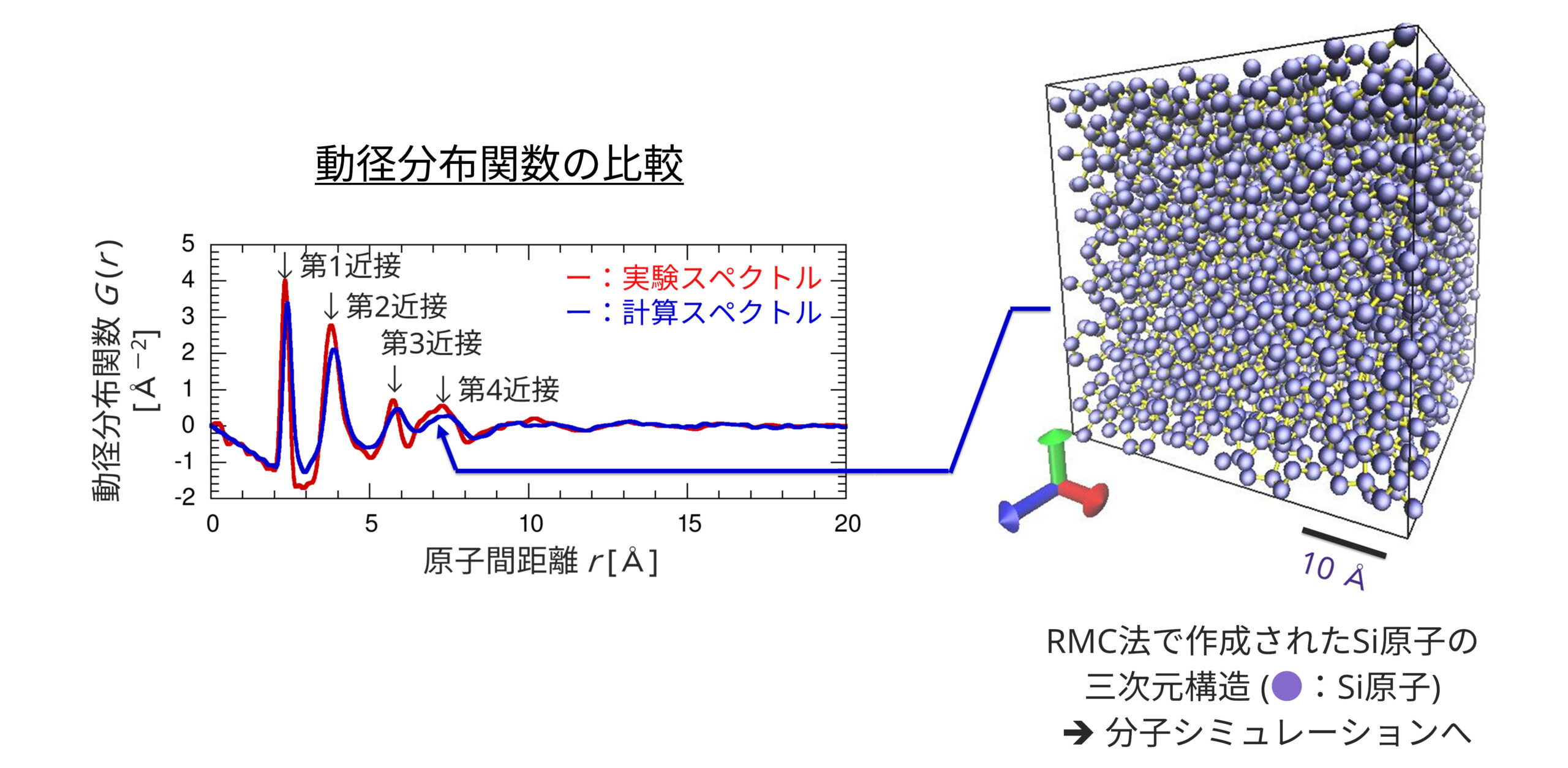 回折実験で得られたスペクトルをもとに原子間相互作用を考慮したリバースモンテカルロ法を駆使することで非晶質材料の分子原子レベルでの三次元構造を予測できます。作成したモデルを分子シミュレーションに接続することで物性予測が可能です。