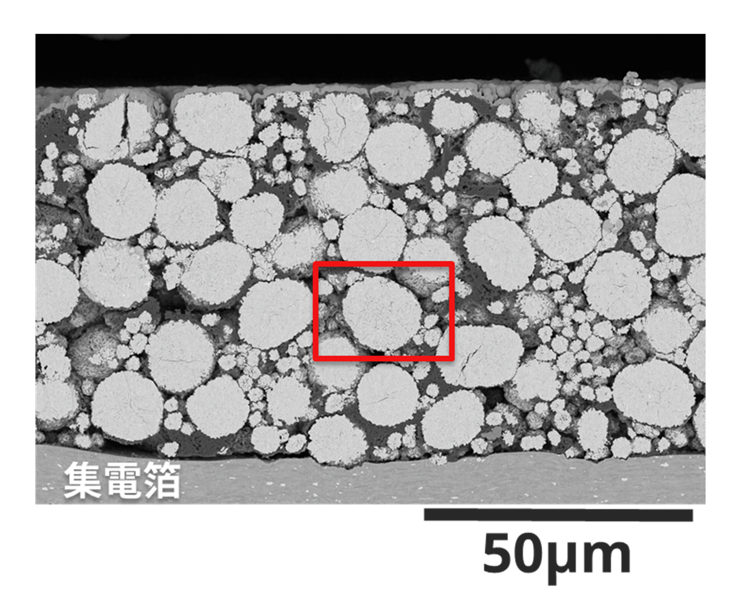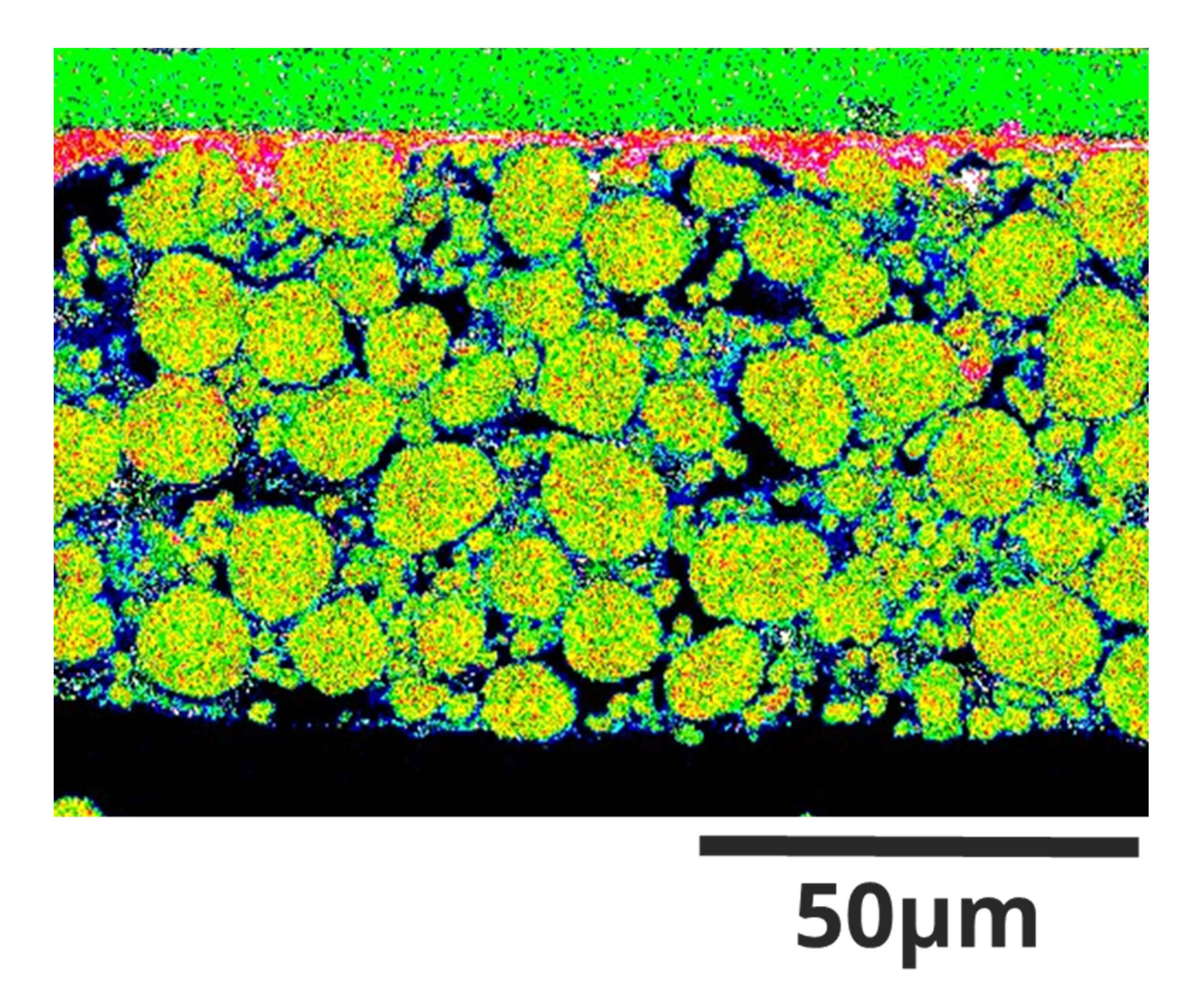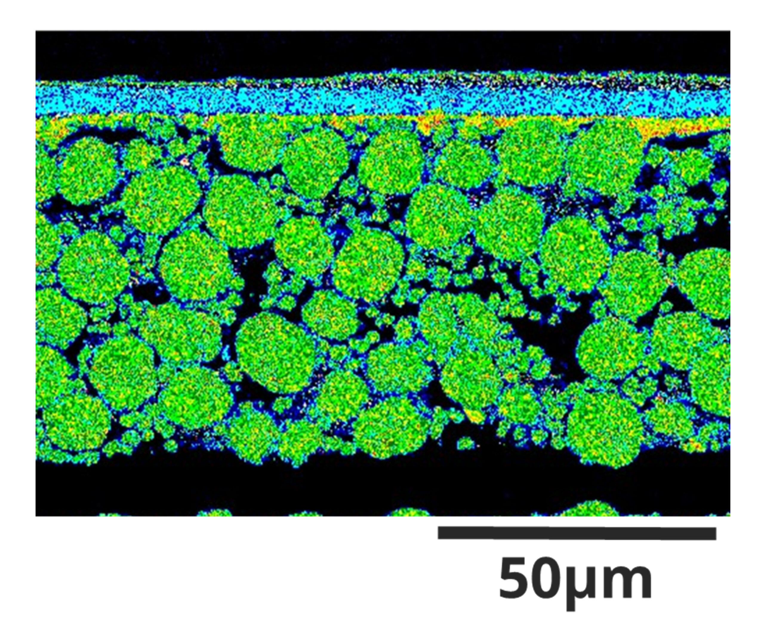ナトリウムイオン電池 (NIB) の正極は活物質や導電助剤、バインダーなどから構成されます。これらの形状や分布の変化によって電子やイオンの導電パスに変化が生じ、電池性能に影響します。SEM-EDXによる断面観察を行うことで、それらの変化を視覚的に捉え、評価することができます。