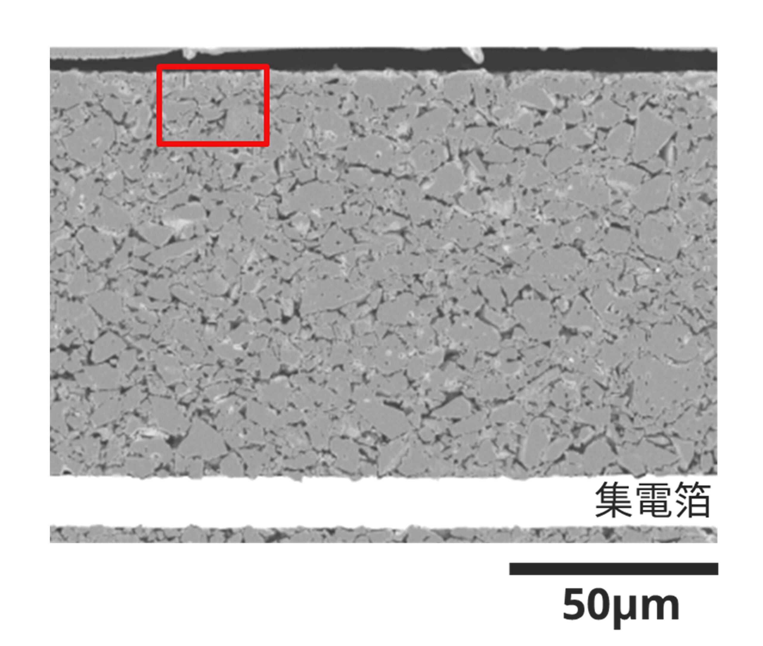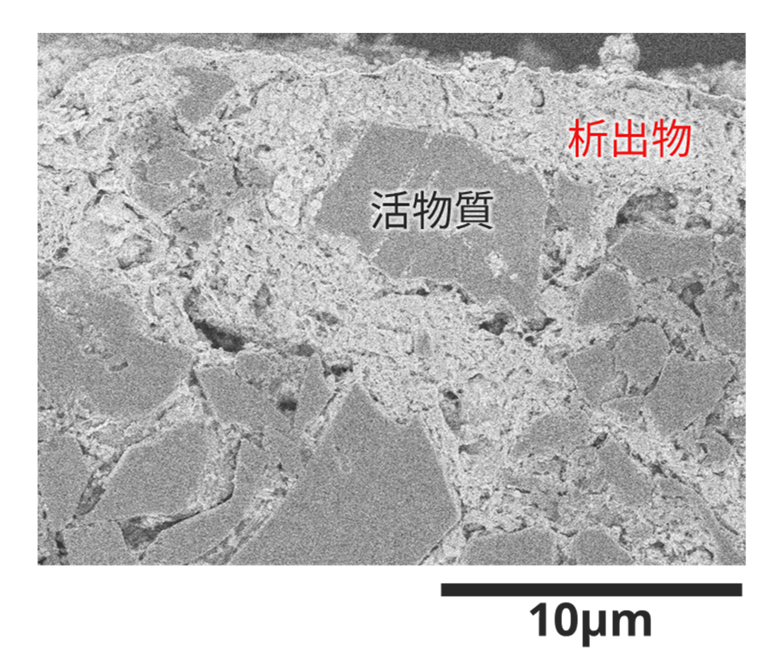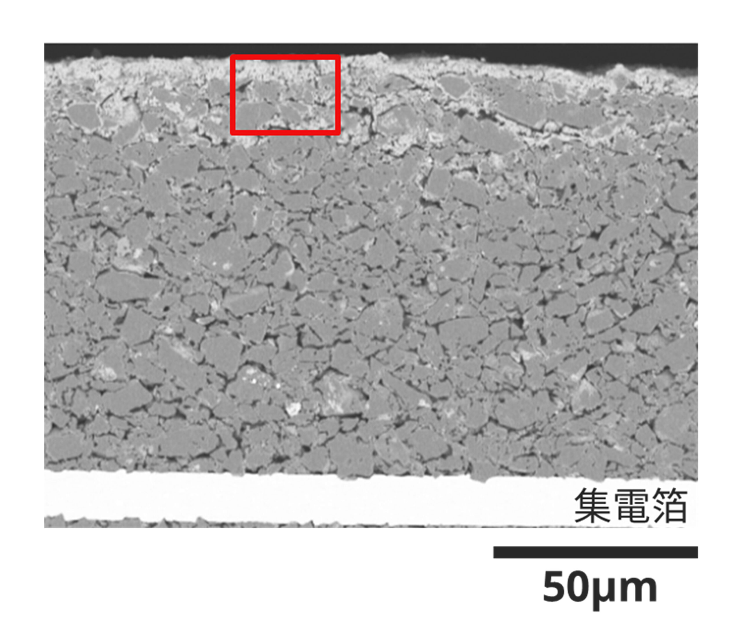 初期品と比較し、100サイクル品・400サイクル品では、電極表面および活物質間に細かい枝状・粒状の析出物と、Naの分布が確認されました。サイクルに伴うNa金属の析出と、析出Na金属上でのSEI成長の促進が推測され、これらは充放電容量低下の一因と考えられます。