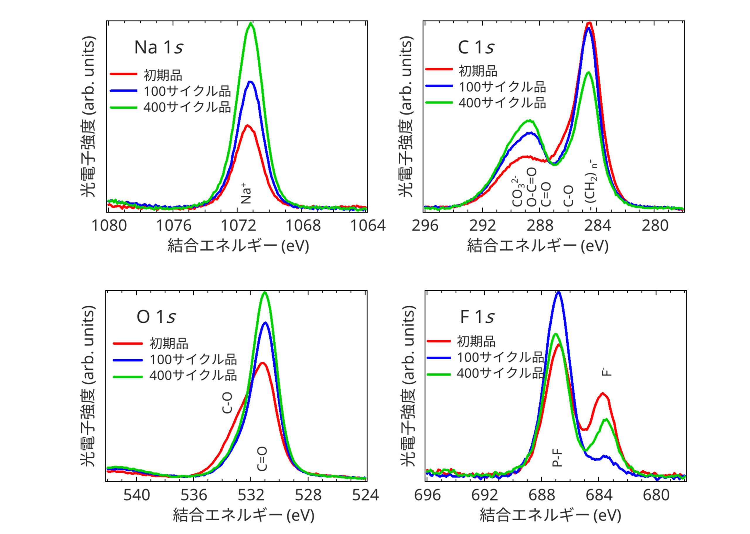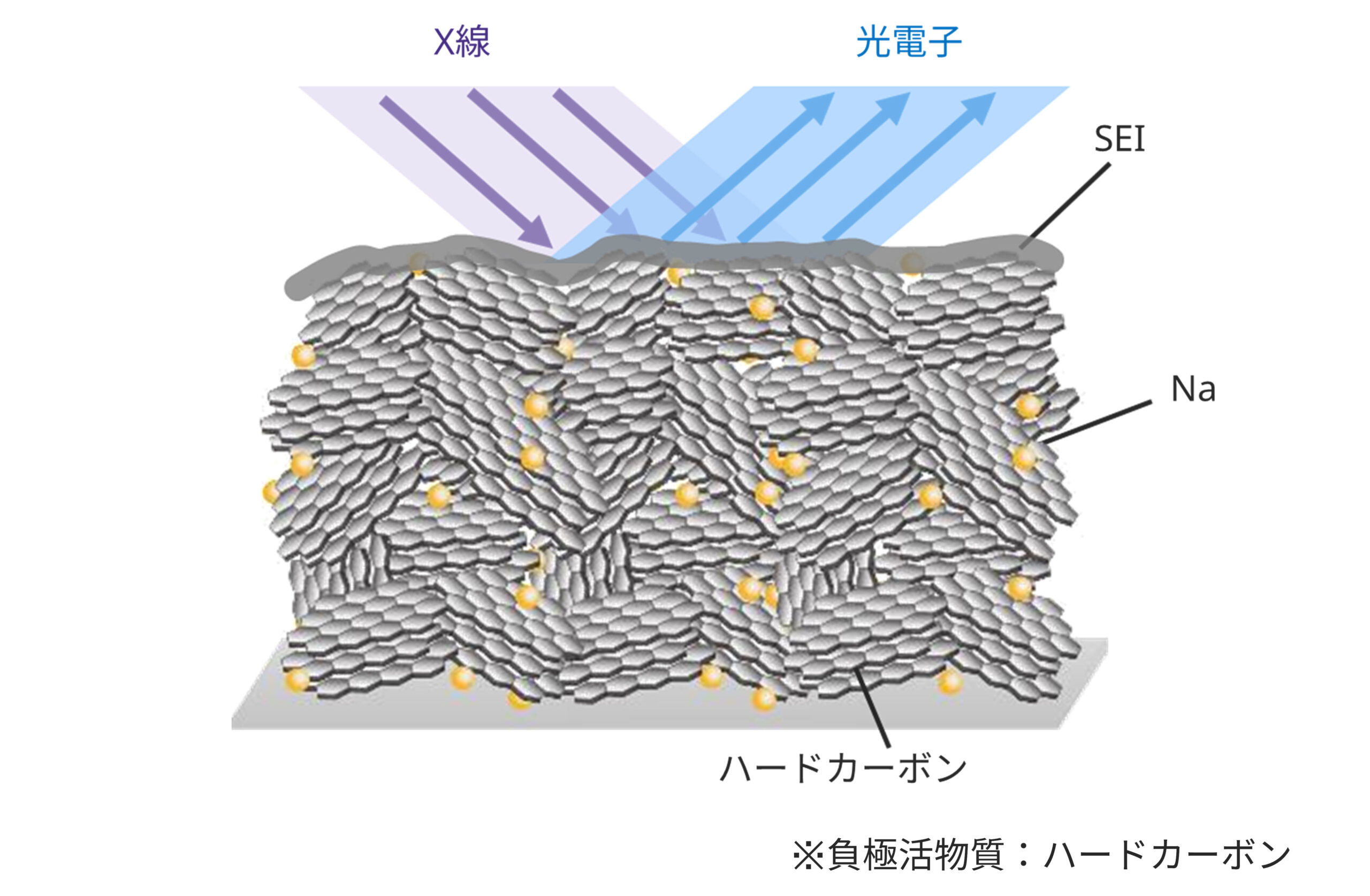 XPSは表面数nm領域におけるNaを含む元素の状態分析と元素含有率を算出することができるため、SEI生成反応を考察する上で有益な情報を得ることができます。