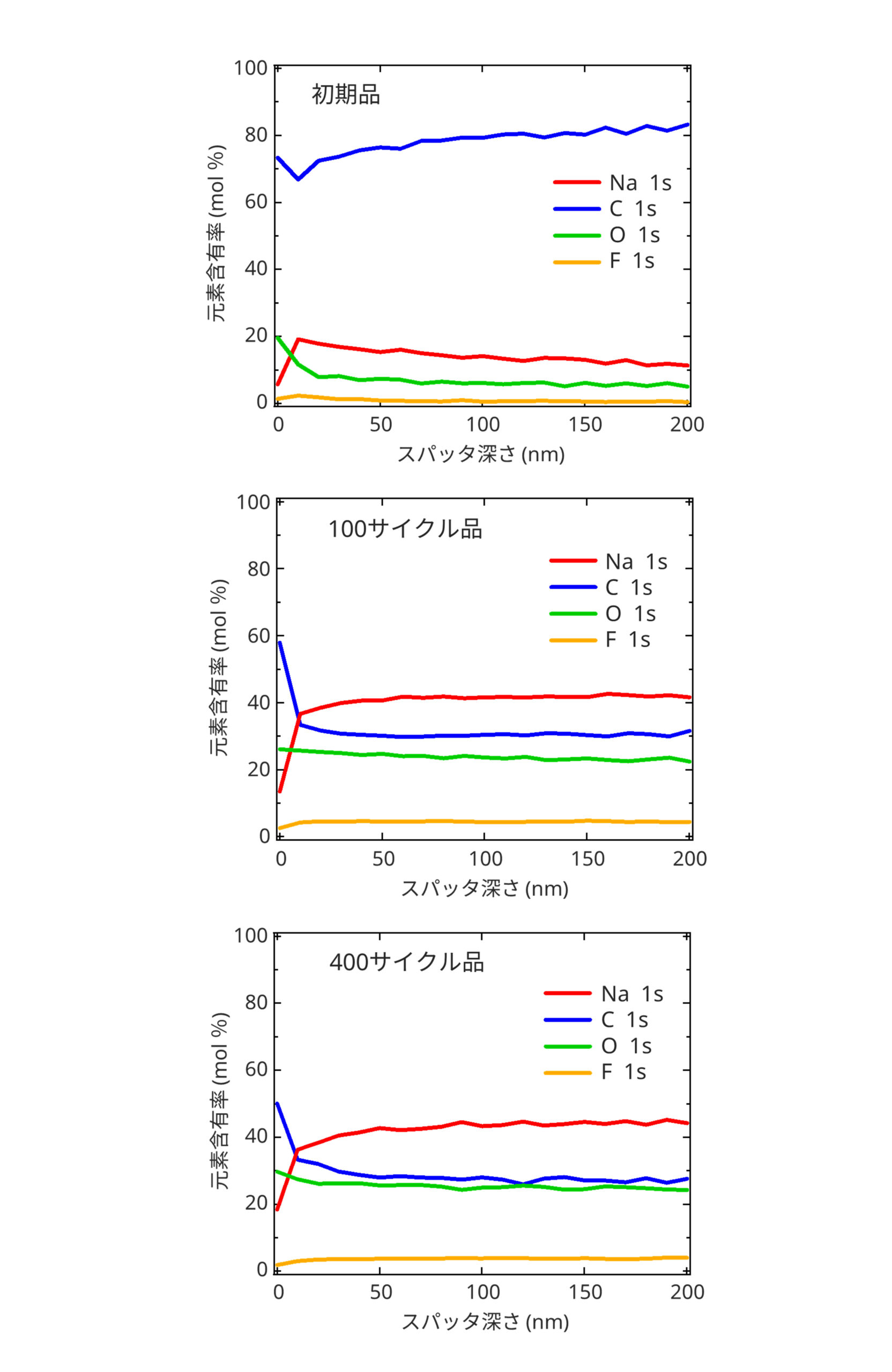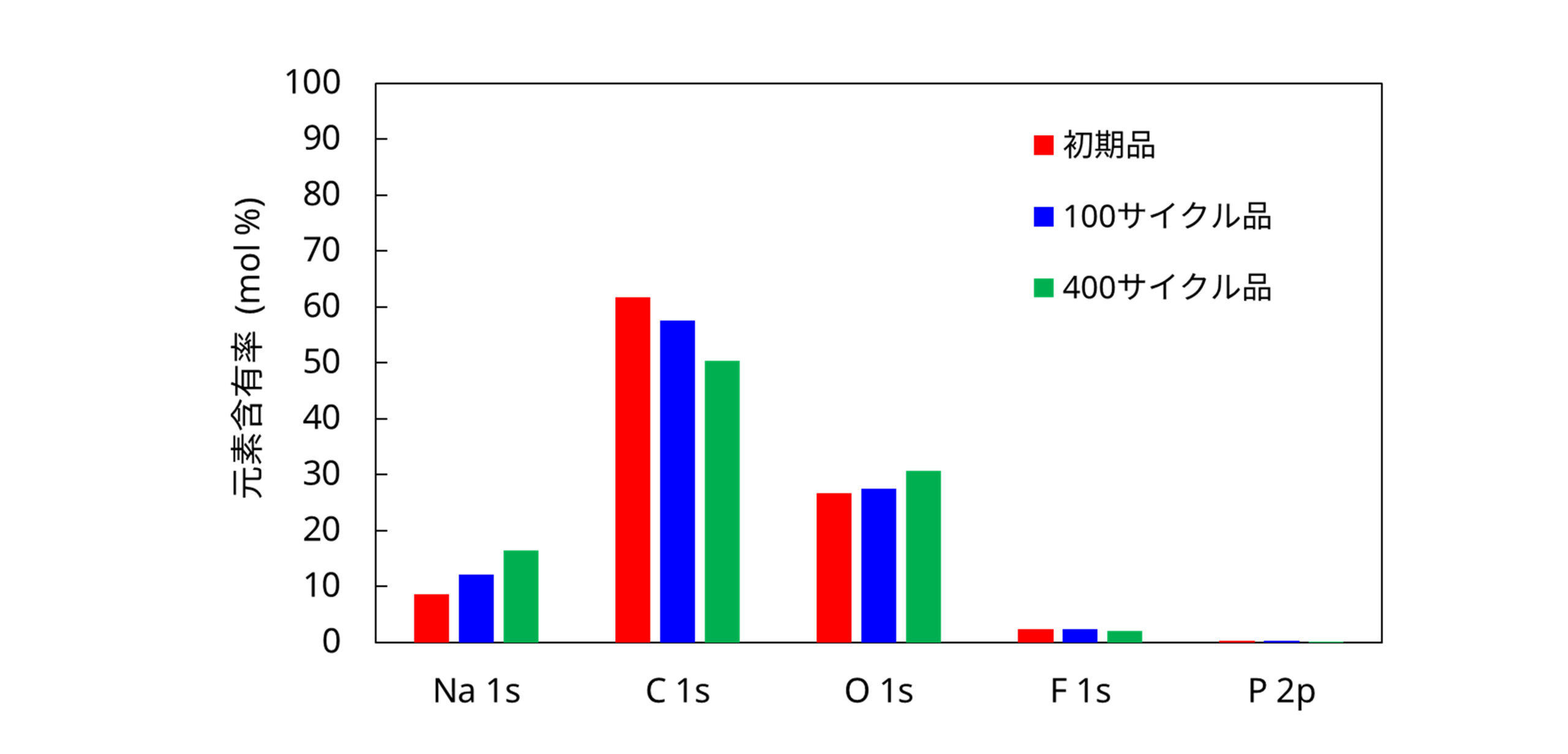 負極表面の定量分析により、Na, O, Cの含有率が全体的に高いことがわかりました。加えて、状態分析によりサイクル数増加に伴いNa2CO3成分の割合が増加する様子が観測されました。これらの結果から、エチレンカーボネート (EC) の還元分解割合が増加していることが推測されます。