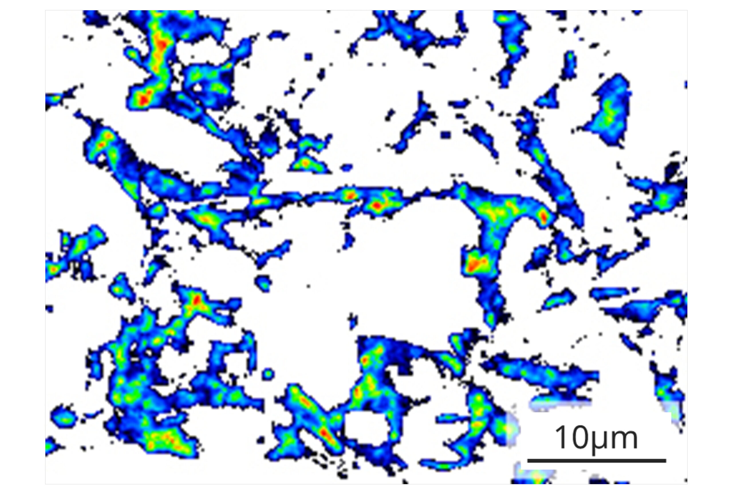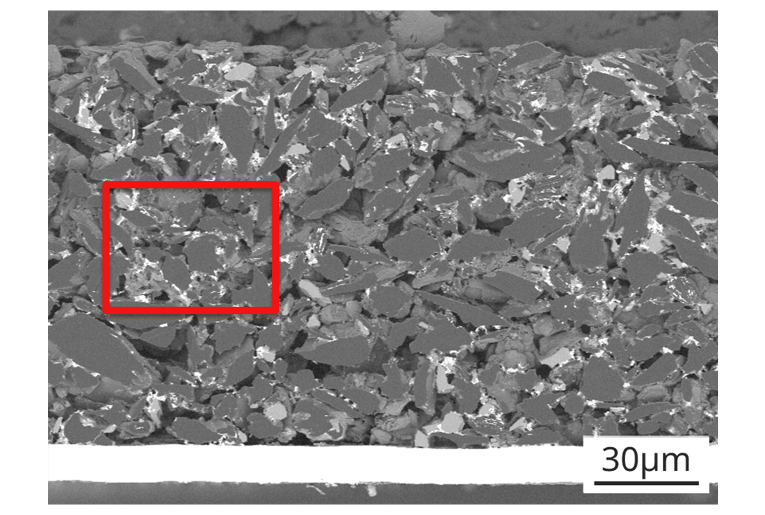 これまでは、電子染色法による重金属の付与やC, H, O以外の特定元素の面分析によりバインダーを可視化していました。しかし、近年主流となってきたSi系負極に多く用いられるポリアクリル酸 (PAA) バインダーは、電子染色法の適用が困難かつ特定元素を持たず、可視化が困難でした。日産アークでは、特殊な前処理を施すことによりPAAバインダーの可視化を実現しました。