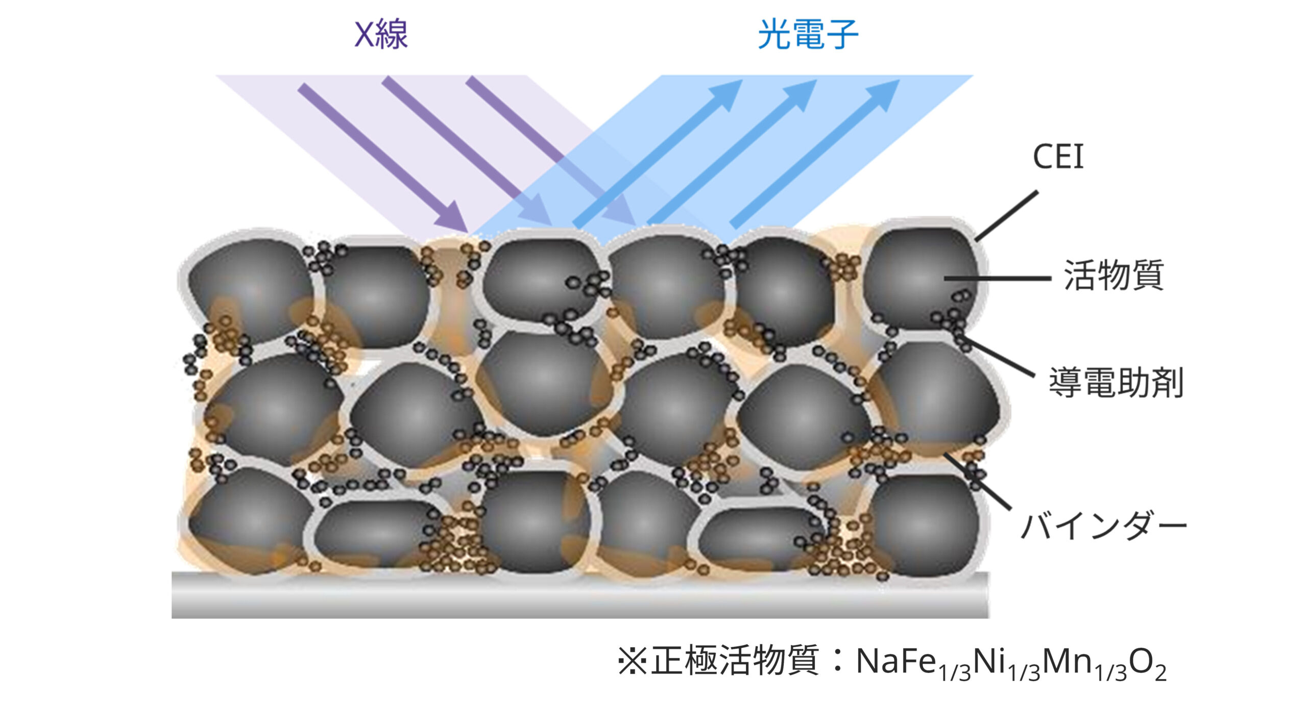 ナトリウムイオン電池 (NIB) におけるCEI (Cathode Electrolyte Interface) は不可逆反応による生成物として電池性能に影響を与えるため、どのような組成のものがどれだけできているか調べることは重要です。