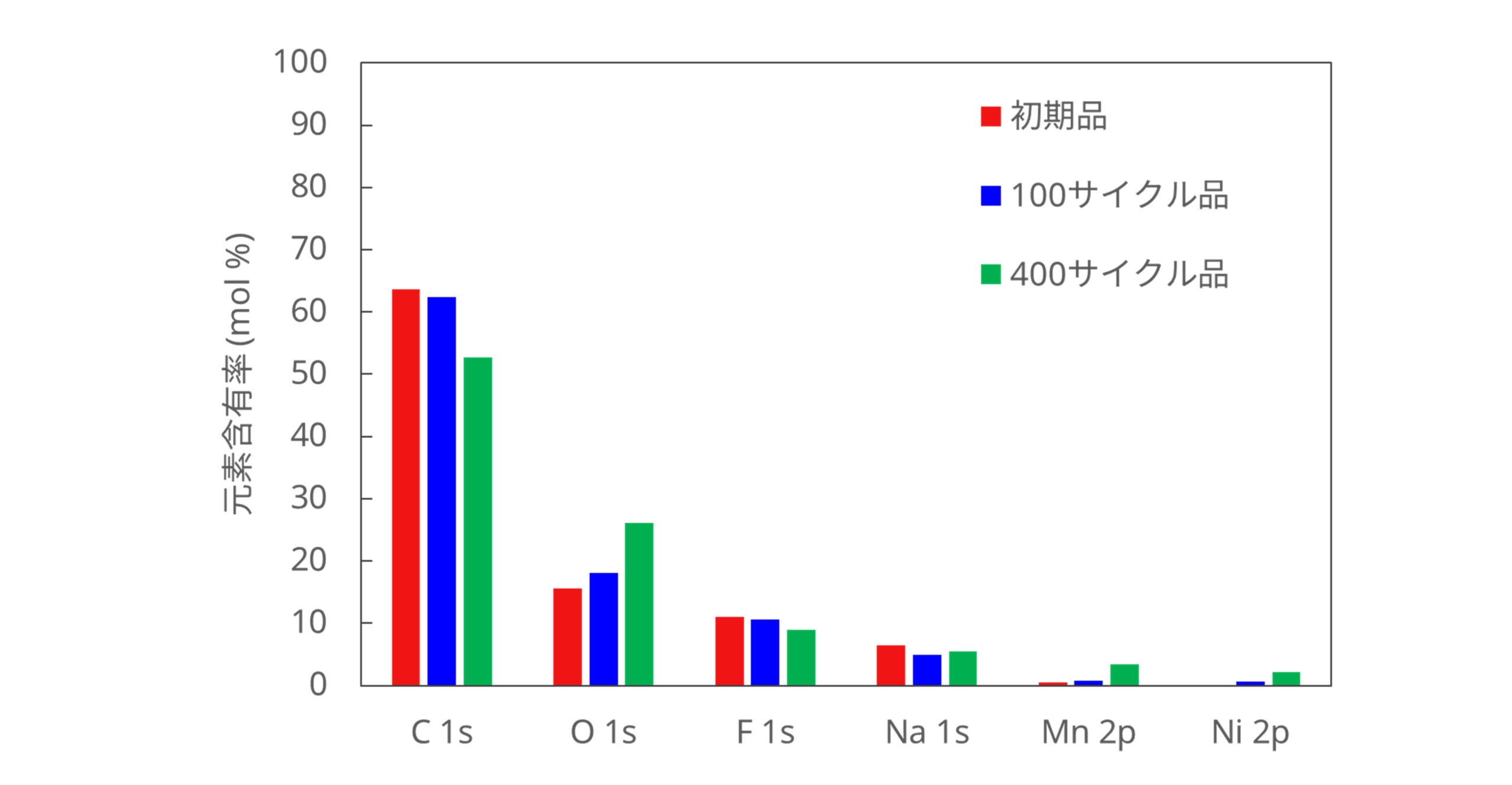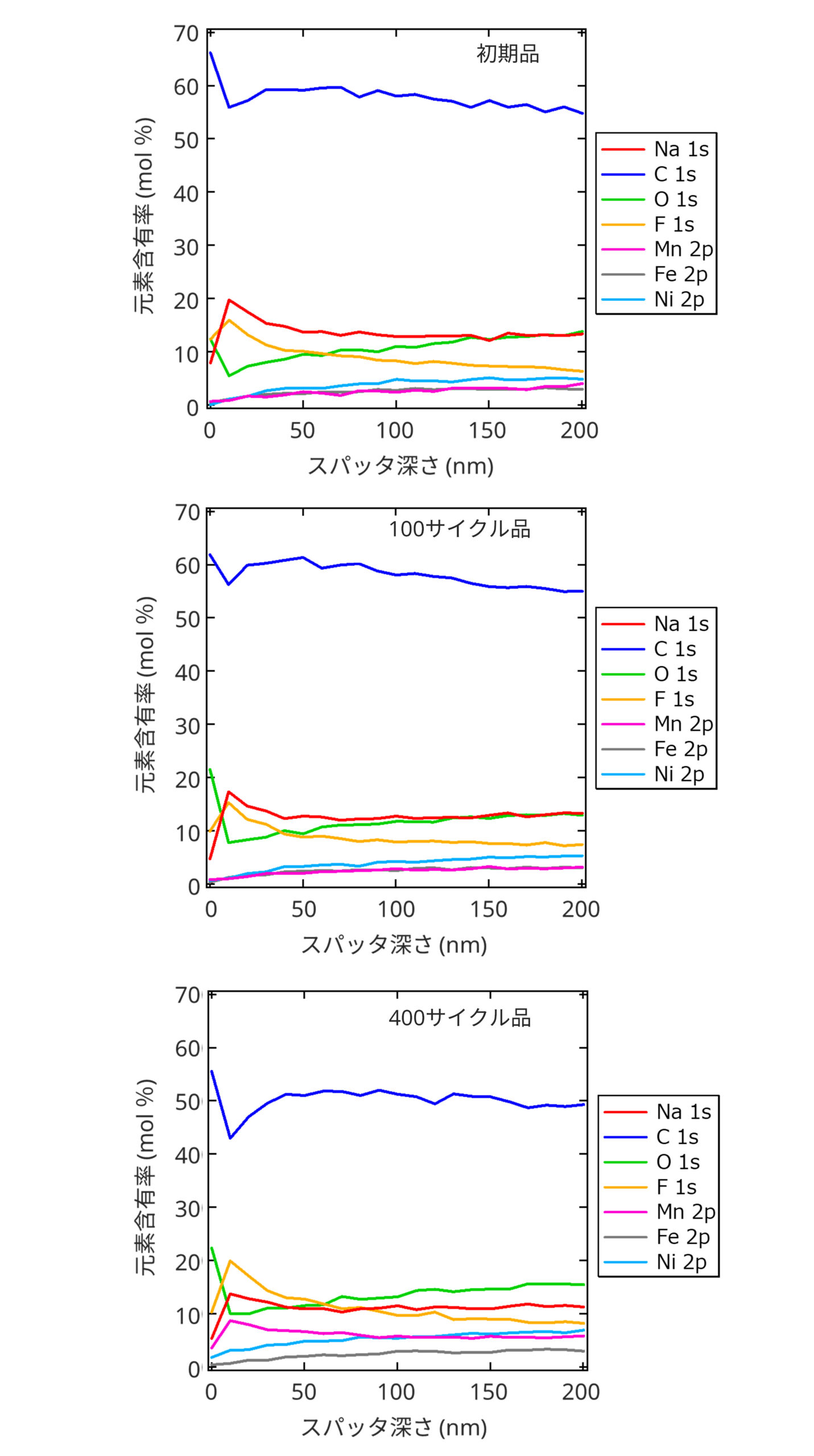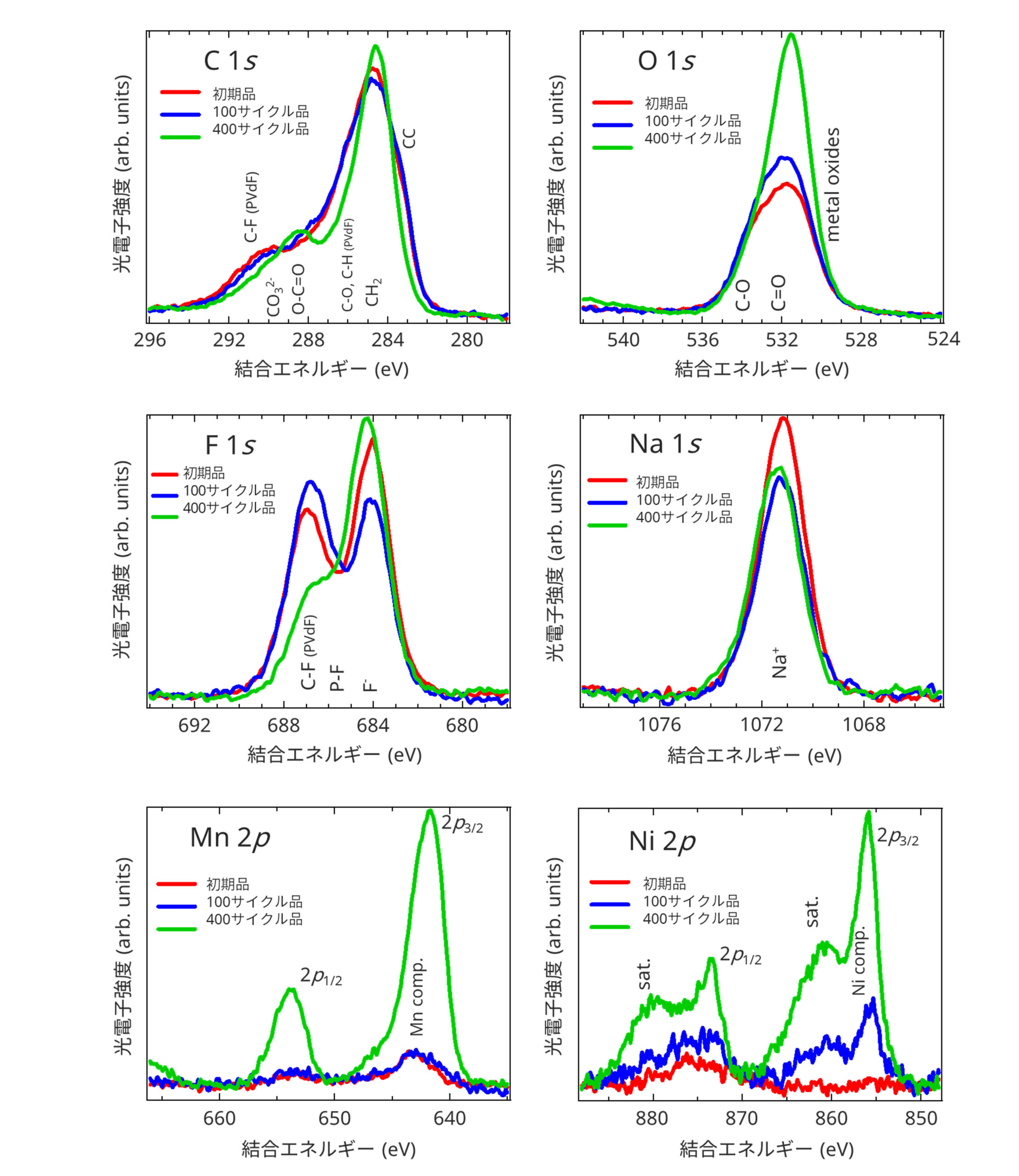 また、 Mn, Niといった活物質由来成分は400サイクル品で観測されました。Mn, Niを含むCEI成分の生成が推測されます。