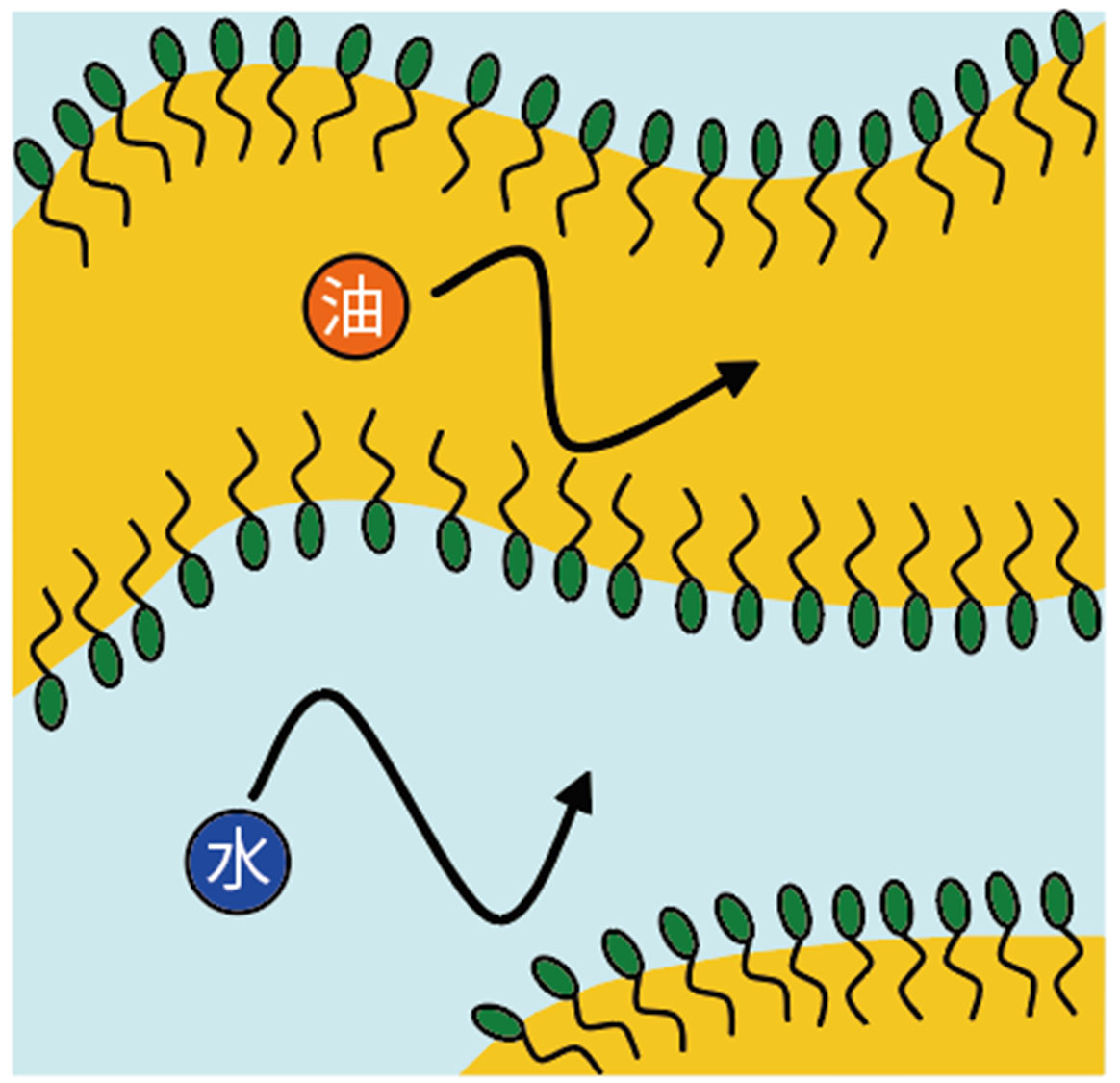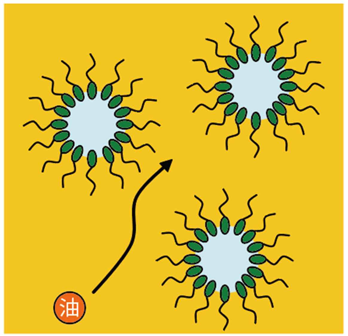 水・油・界面活性剤の3成分系では、組成・温度により、水中油滴 (O/W) 型エマルション・ミセル・液晶・両連続・逆ミセル・油中水滴 (W/O) 型エマルションなどの様々な構造を形成します。