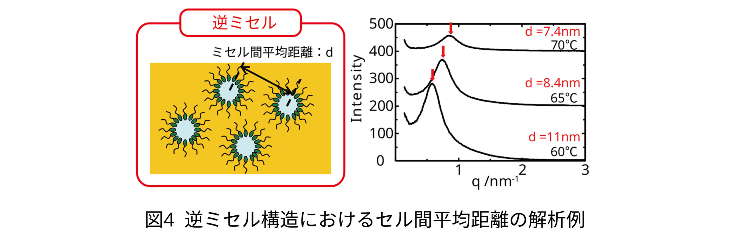 ミセル構造および逆ミセル構造においては、濃厚な系であれば長周期構造に関する情報が得られ、ピーク位置からミセル間平均距離を求めることができます(図4)。また、希薄な系であれば粒子のサイズや形状の評価が可能です。