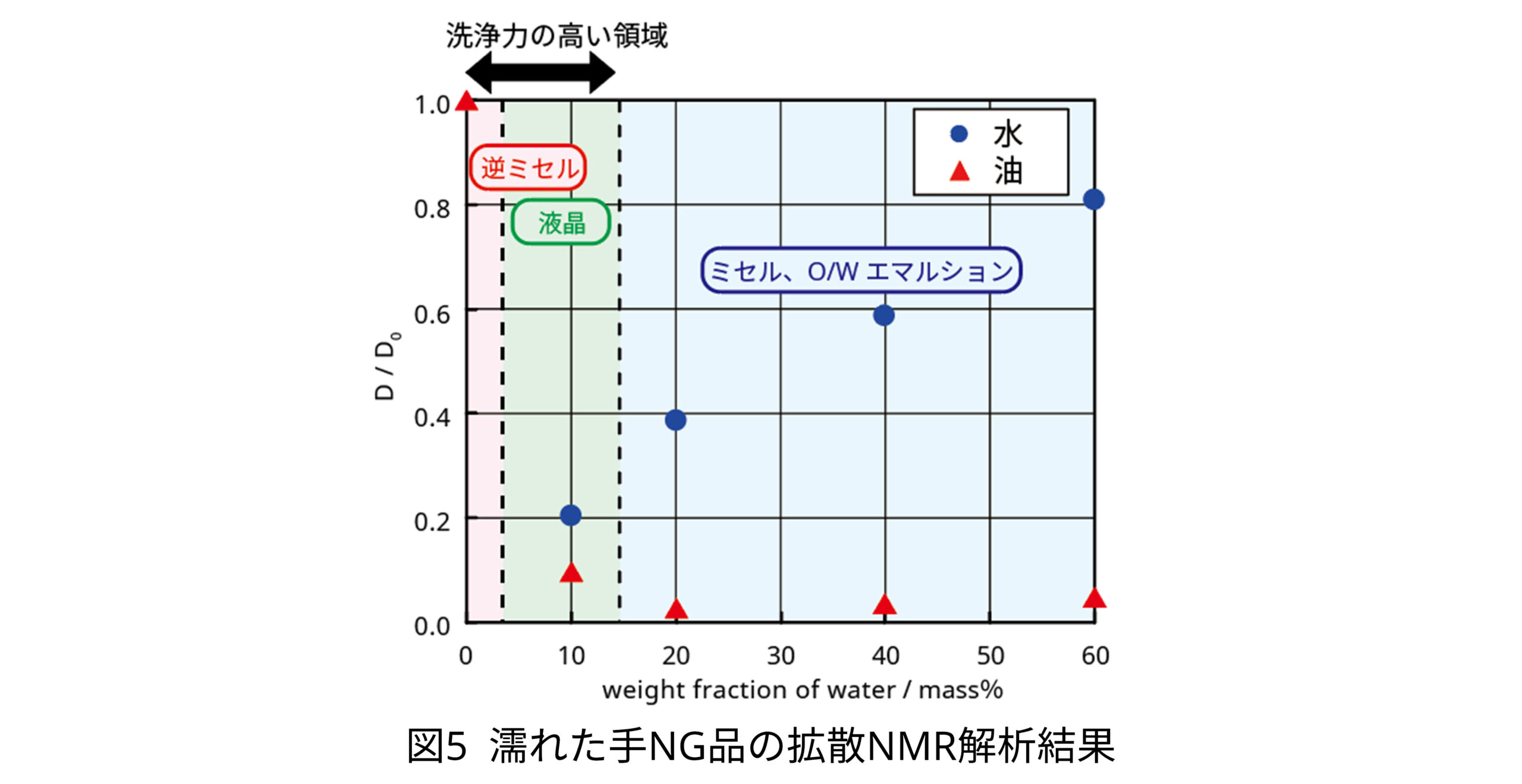 以上の結果から、濡れた手OK品はNG品に対し、洗浄力の高い領域 (逆ミセルおよび液晶領域) が広いことがわかりました。