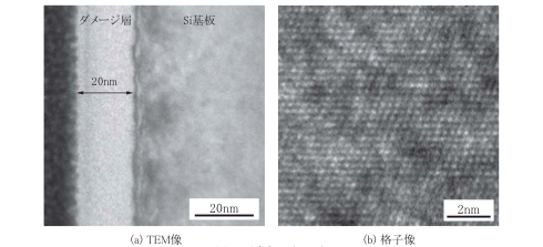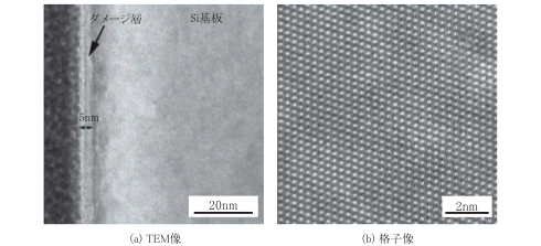 そこで、当社ではFIBのイオンビーム加速電圧を下げて仕上げを行うことにより、ダメージ層をできるだけ薄くする方法を確立しました。図3 (a) のように、「低加速仕上げ法」により試料側面のダメージ層は5nmまで低減し、格子像も図3 (b) のように鮮明に得ることができました。