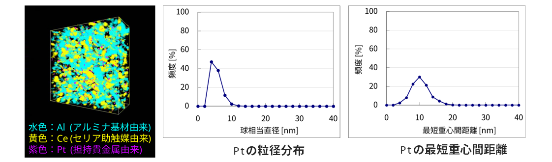 触媒性能の向上や劣化解析において触媒元素の三次元分布を定量的に把握することは重要です。高感度TEM-EDXを用いた形態観察から元素の三次元分布を把握し、触媒性能と関連のあるパラメータを定量化することが可能です。