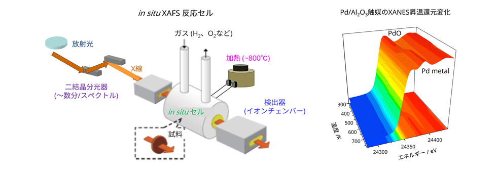 XAFSは、試料にX線を照射しその吸収特性から試料の化学状態や結合構造を分析する手法です。反応セルを準備し、ガス雰囲気や環境温度を制御しながら測定を行うことで実際の使用環境条件を再現した動的な評価が可能です。
