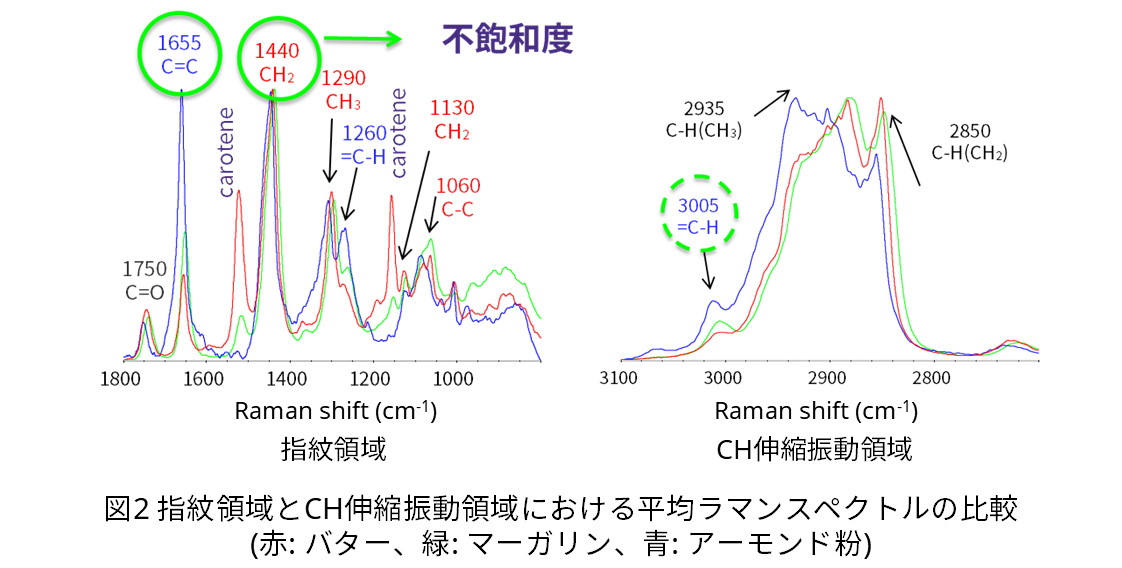 ラマンスペクトルにおける、 C=C と CH2、あるいは、=C-H と CH2 のピークの相対面積比は、測定箇所の脂肪酸の不飽和度を反映します。