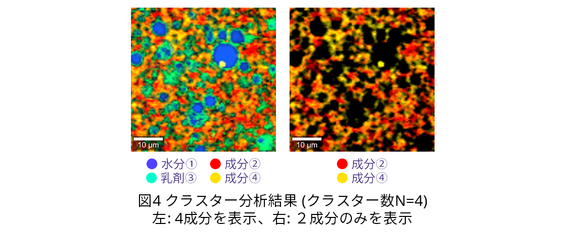 図4に、マーガリンのラマンイメージングデータから油脂系成分をクラスター分析により識別した事例を示します。イメージングデータ (50×50μm, 22500スペクトル) をクラスター数 N=4で解析を行いました。