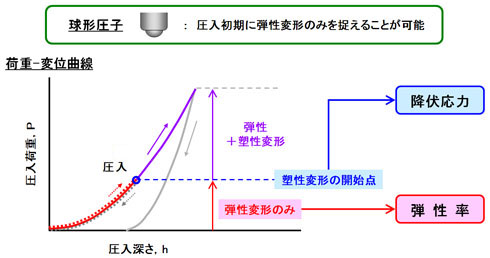 圧入初期の弾性変形挙動から弾性率を、塑性変形の開始点から降伏応力を測定することが可能です。