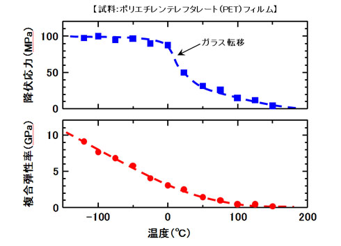 フィルム化によりガラス転移温度が低下し、10℃以上で降伏応力が急激に低下することがわかります (※一般的なバルク材のガラス転移は約70℃) 。微小領域や薄膜における降伏応力・弾性率の温度依存性評価が可能です。