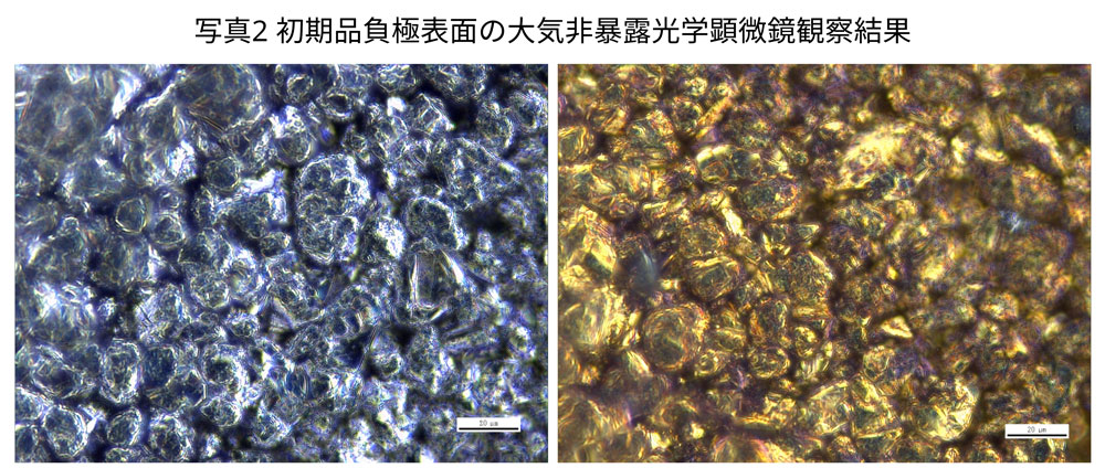 写真2に初期品負極表面を光学顕微鏡で観察した写真を示します。写真2 (a) に示す放電状態負極のOM像により、負極活物質は10~30μm程度の粒状であることが確認できます。