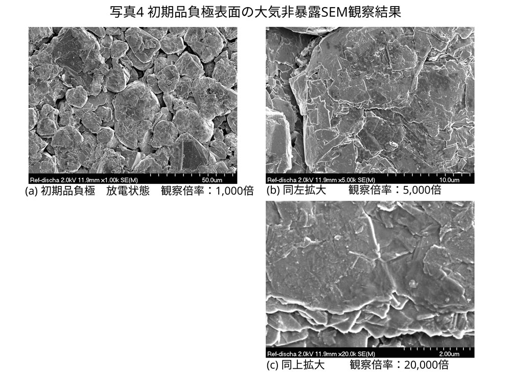 さらに倍率を上げ、倍率20,000倍で観察を行うと (写真4 (c) 、活物質表面に生成しているSEI膜が確認できます。