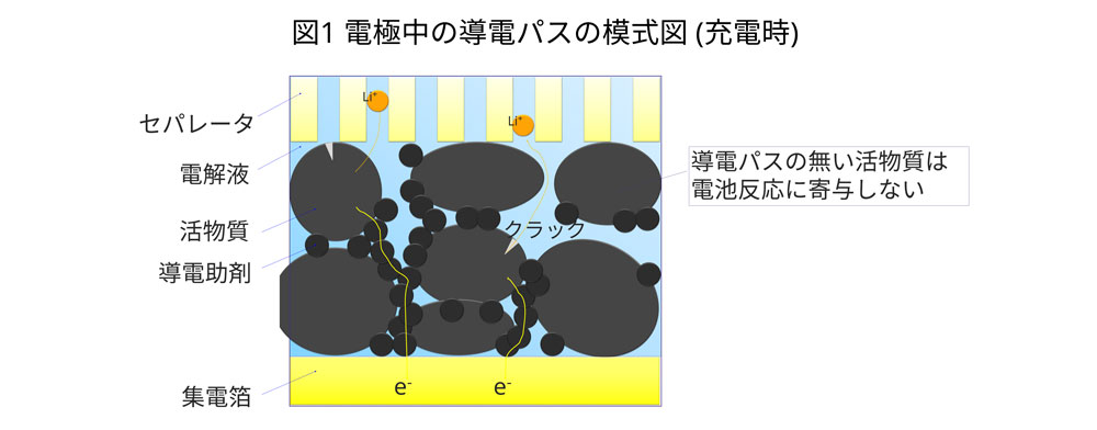 正極はLiイオンや電子の源である活物質の他にこれらの通り道となる導電助剤やバインダーなどから構成されます。これらの形状や分布が変化することで電子やイオンの伝導パスの変化が起こり、電池性能に影響するため、その状態を知っておくことは重要です。