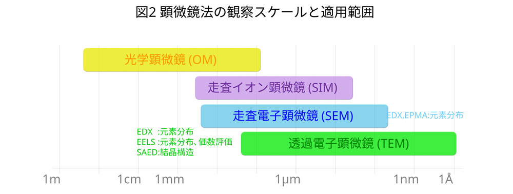 目的や領域の大きさにより観察はOM, SEM, SIM, TEM、分析はEPMAやEDXを使い分けします。SEMやSIMは比較的低倍率で広範囲の情報、TEMは高倍率で微細領域の情報が得られます (図2)。