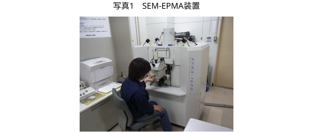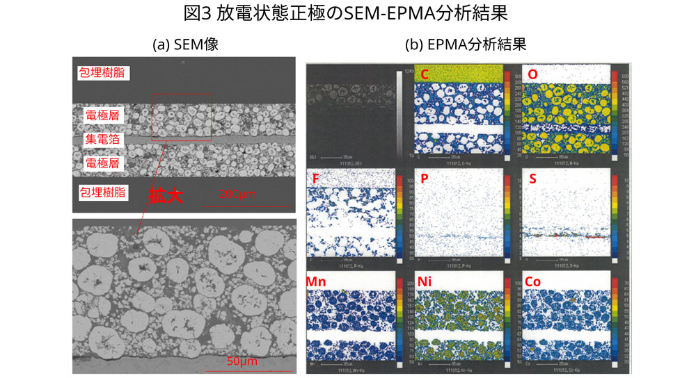 SEM-EPMA装置 (写真1) を用いて、放電状態正極のSEM (走査電子顕微鏡) 観察とEPMA (電子線プローブマイクロアナライザー) 分析を行った結果を図3に示します。SEM観察から、正極には大きさ10数μmと数μmの2種類の活物質粒子が見られます。EPMA分析から、これらはともにMn, Co, Niを含み組成にも大きな差はないと判断されました。さらに主にバインダー由来のFが電極表面に多く存在していることも分かります。