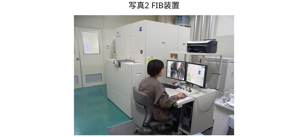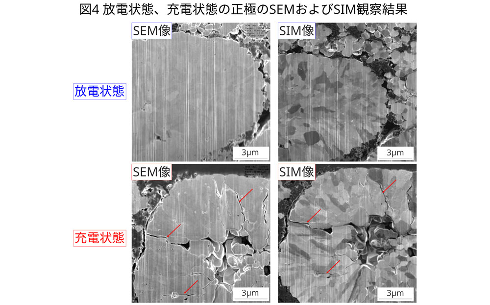 FIB-SIM装置 (写真2) で、正極の一部を拡大しSEMとSIM (走査イオン顕微鏡) で撮影した結果を図4に示します。SIMはSEMと比べて組成や結晶方位によるコントラストが強く現れます。SIM観察の結果から、2種類の大きさの活物質粒子はともに大きさ数100nm~1μmの粒子からなることがわかりました。さらに、充電後の活物質には粒界に沿ってクラックが生じている様子が観測されました。