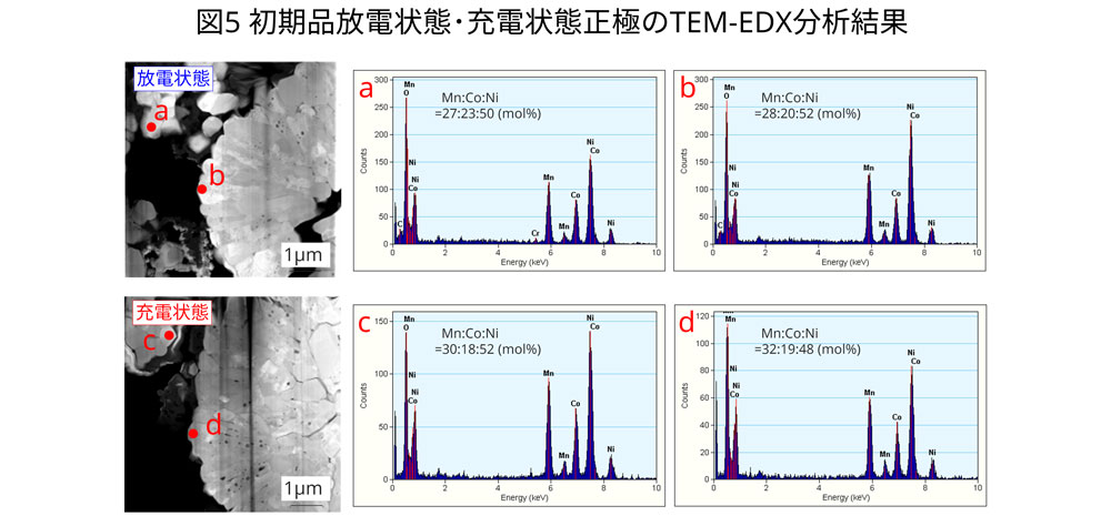 図5は放電状態、充電状態の正極活物質TEM観察結果とEDX分析結果です。放電状態と充電状態、さらには大きさ10数μmと数μmの2種類の活物質粒子とで、Mn, Co, Niの組成に顕著な差はないことが確認できました。