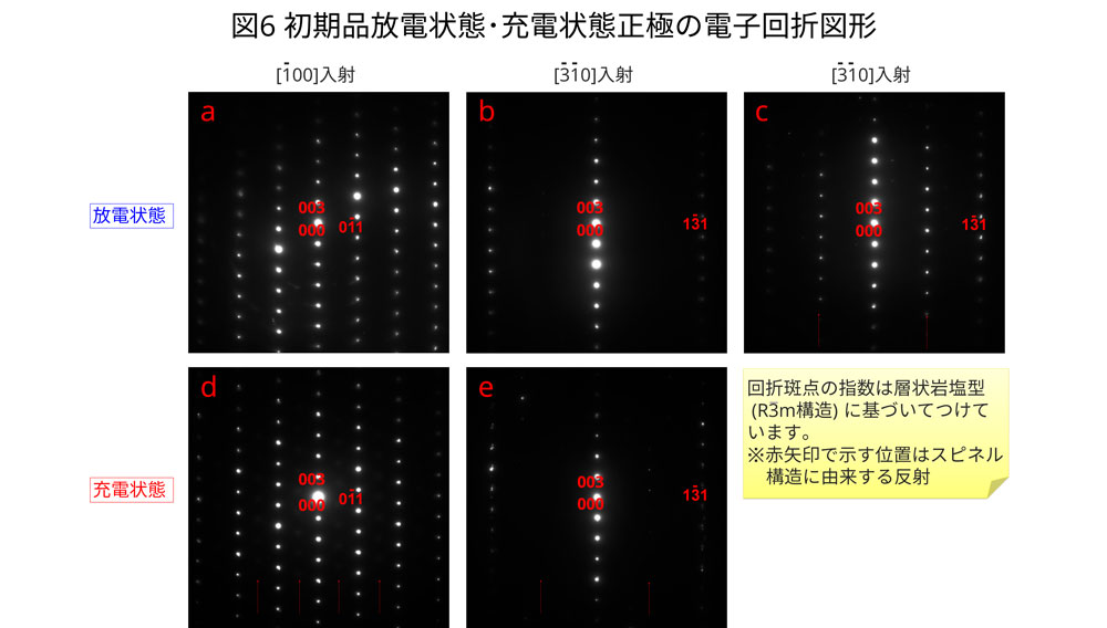 図6は放電状態と充電状態の活物質粒子から得られた電子回折図形です。放電状態の試料では、a,bのように層状岩塩型構造の回折図形を示す領域と、cのようにスピネル構造の回折図形を示す領域が見られました。このことから、層状岩塩とスピネルの2つの構造が共存していることが分かりました。一方、充電状態の電子回折図形 (d, e) には、層状岩塩型構造の反射の他に、赤矢印で示すスピネル構造の反射位置に弱い反射や散漫散乱が見られました。このことから充電状態では層状岩塩型構造にわずかにスピネル構造が共存していることがわかりました。