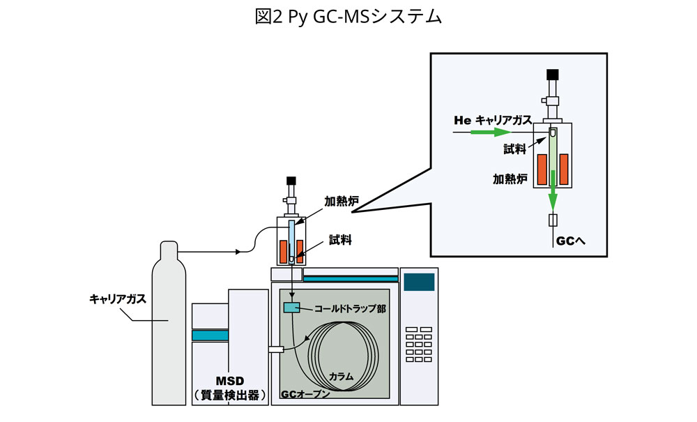 PyGC-MS (熱分解ガスクロマトグラフ-質量分析計) によって分析してます。