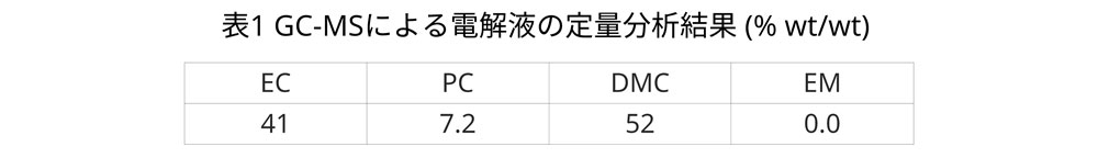 図3,4に示すGC-MS分析の結果から、エチレンカーボネート (EC)、プロピレンカーボネート (PC)、ジメチルカーボネート (DMC)、そして微量のエチルメチルカーボネート (EMC) が検出されました。また、定量結果は表1のようになりました。